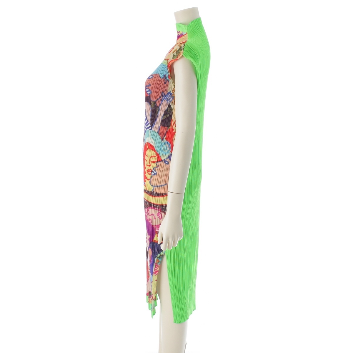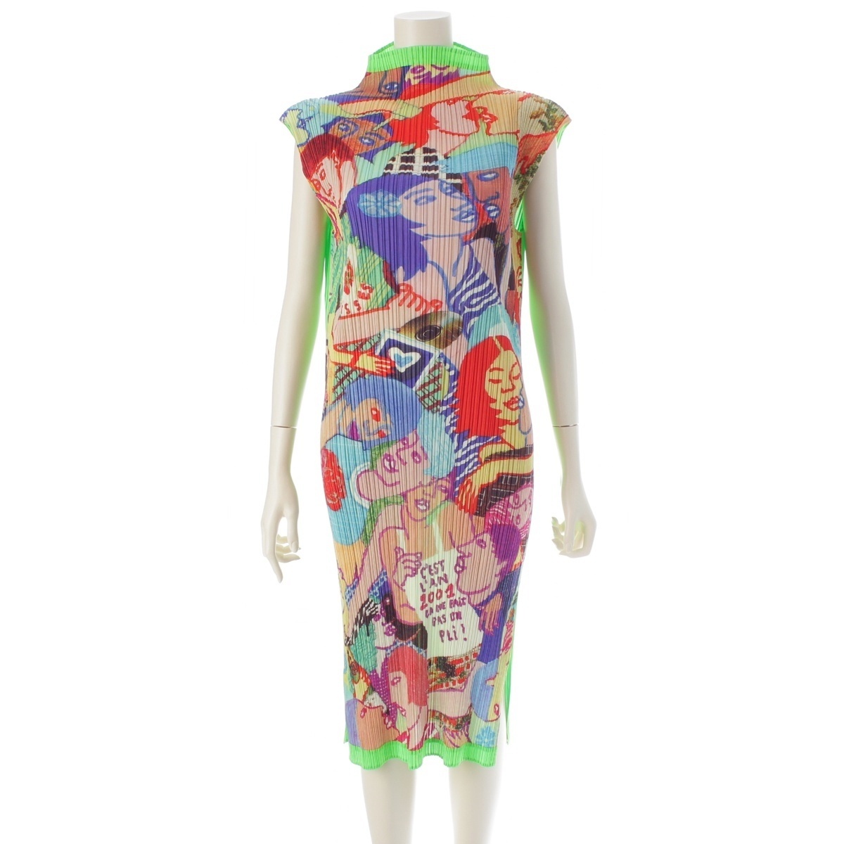 プリーツプリーズ イッセイミヤケ Lamia Ziade グラフィティ 総柄 ボトルネック ノースリーブ ワンピース PP12-JH221 グリーン 4【中古】 收藏