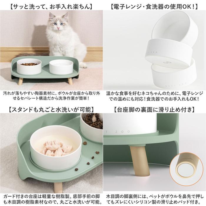| 商品説明 | ・・【ペットに優しい、思いやり設計】 ・猫ちゃん、ワンちゃんが自然な姿勢で快適にお食事できる「ペット用フードボウル&スタンドセット」 ・【食器がふわっと浮かんで食べやすい】 ・滑らかな陶器の食器を優しい色合いのスタンドでリフトアップ。楽な姿勢でお食事できる高さに設計。 ・【絶妙な高さが食べやすさのヒミツ】 ・ボウルをペットのお顔の高さまで約6cm程度近づけ、前屈みにならずに食べられる優しい造り。 ・※フードボウルを台座に載せた状態で、ボウルの底部が高さ約6cm、フチの高さが約10cm程度です。 ・【ペットの身体に優しいつくり】 ・首や腰への負担を和らげてくれるので、シニアのネコちゃんや病気で治療中の愛猫にもオススメ。 ・【たっぷり入ってこぼれにくい】 ・ボウル内側はフードやお水がこぼれにくい程よい深さ!食べこぼし汚れの片付け手間もグッと楽に。 ・【飛び散り汚れをしっかりガード】 ・台座には2つのボウルを取り囲むようにガードが付いており、床や壁への飛び散り汚れを未然に防止。 ・【安定感のあるセラミック(陶器)製】 ・どっしりと重みのある陶器製のボウル底面が、台座にピタッと置ける構造なので、安定感も抜群。 ・【ネコ缶がそのまま置けるくぼみ付】 ・台座中央の丸いくぼみには、ネコ用缶詰めがカチッと収まるくぼみ付きなのも嬉しいポイント! ・※猫ちゃんが缶詰めのフチでお口を怪我しないようにご配慮ください。 ・【サッと洗って、お手入れ楽ちん】 ・汚れが落ちやすい陶器素材に、ボウルが台座から取り外せるセパレート構造だから洗浄作業が簡単! ・【電子レンジ・食洗器の使用OK!】 ・温かな食事を好むネコちゃんのために、電子レンジでの温めにも対応!食洗器でのお手入れもOK! ・※電子レンジでの温めの際は、温めすぎにご注意ください。猫は人肌程度に温めたフードを好む傾向があります。 ・【スタンドも丸ごと水洗いが可能】 ・ガード付きの台座は軽量な樹脂製。底部手前の脚も木目調の樹脂素材なので、丸ごと水洗いが可能。 |