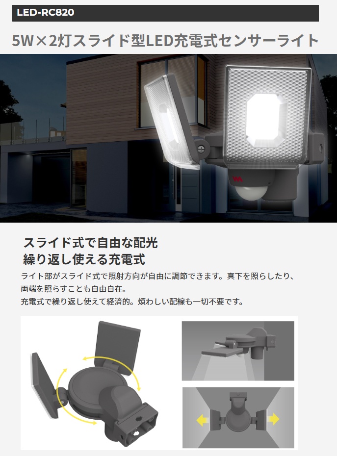 ムサシ LED-RC820 5Wx2灯スライド型LED充電式センサーライト 屋外向け RITEX musashi 收藏