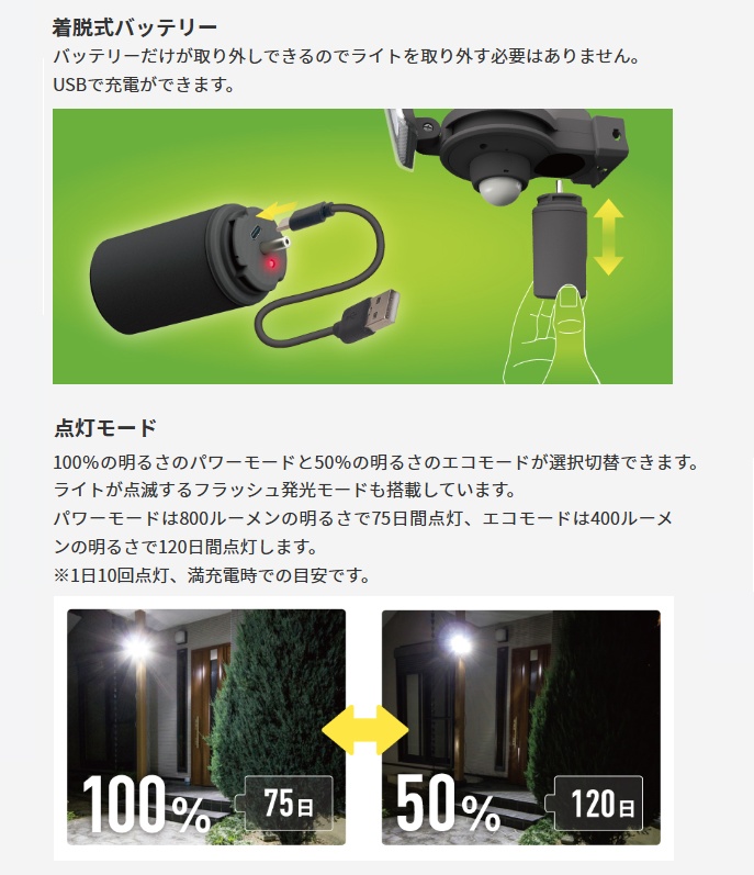 ムサシ musashi5W×2灯スライド型LED充電式センサーライトLED-RC820■スライド式で自由な配光 繰り返し使える充電式ライト部がスライド式で照射方向が自由に調節できます。真下を照らしたり、両端を照らすことも自由自在。充電式で繰り返し使えて経済的。煩わしい配線も一切不要です。■着脱式バッテリーバッテリーだけが取り外しできるのでライトを取り外す必要はありません。USBで充電ができます。■点灯モード100%の明るさのパワーモードと50%の明るさのエコモードが選択切替できます。ライトが点滅するフラッシュ発光モードも搭載しています。パワーモードは800ルーメンの明るさで75日間点灯、エコモードは400ルーメンの明るさで120日間点灯します。※1日10回点灯、満充電時での目安です。