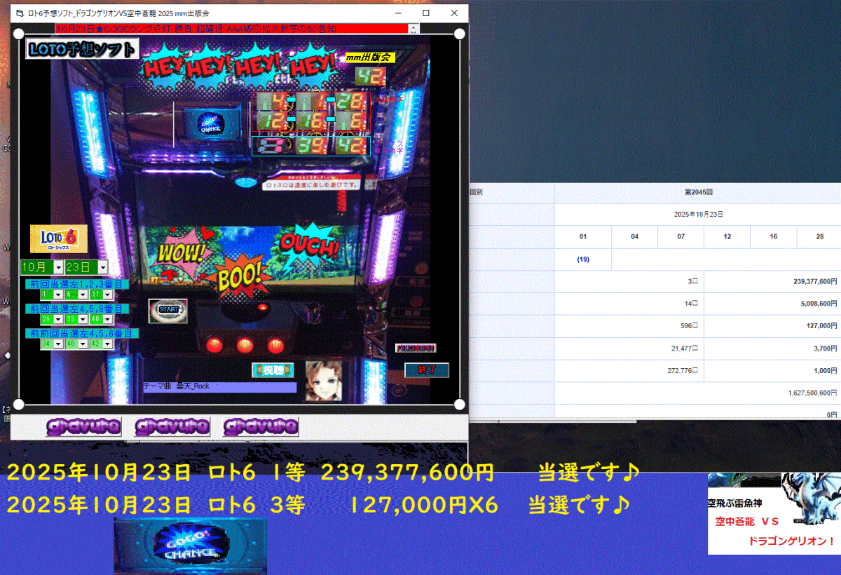 新作[ロト6予想ソフト_ドラゴンゲリオンVS空中蒼龍2025] 2025年10月23日 ロト6 1等 239,377,600円 当選です♪
