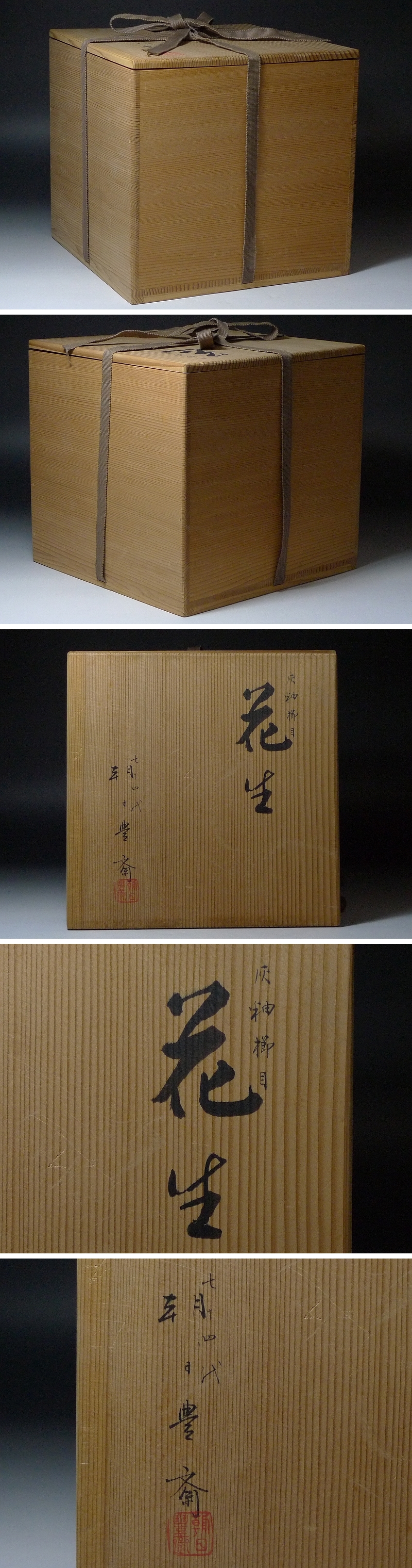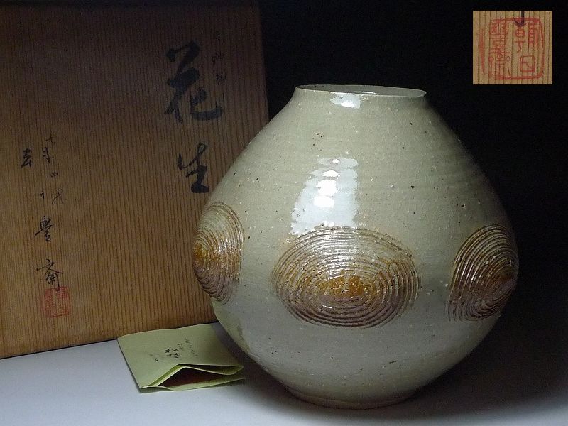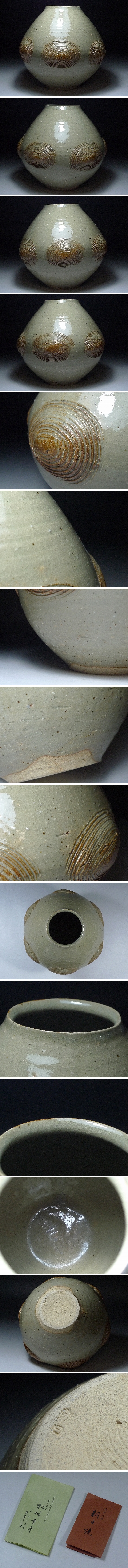 10TR68★遠州七窯 朝日焼 七十四代 朝日豊斎造 灰釉櫛目 花生 共箱付 花器 花瓶 陶器 置物 茶道具 華道具 收藏