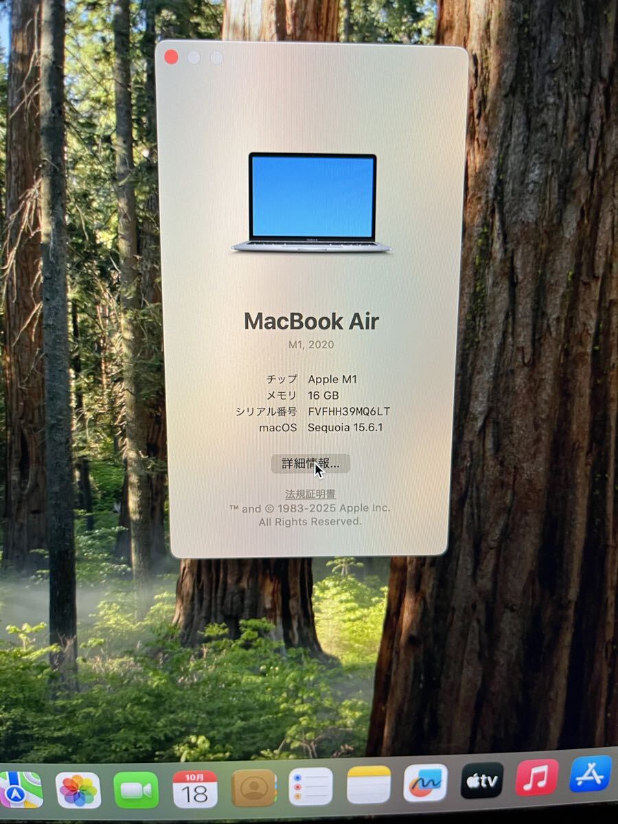 Apple M1チップ搭載、16GBメモリのMacBook Air、13.3インチRetinaディスプレイ。
