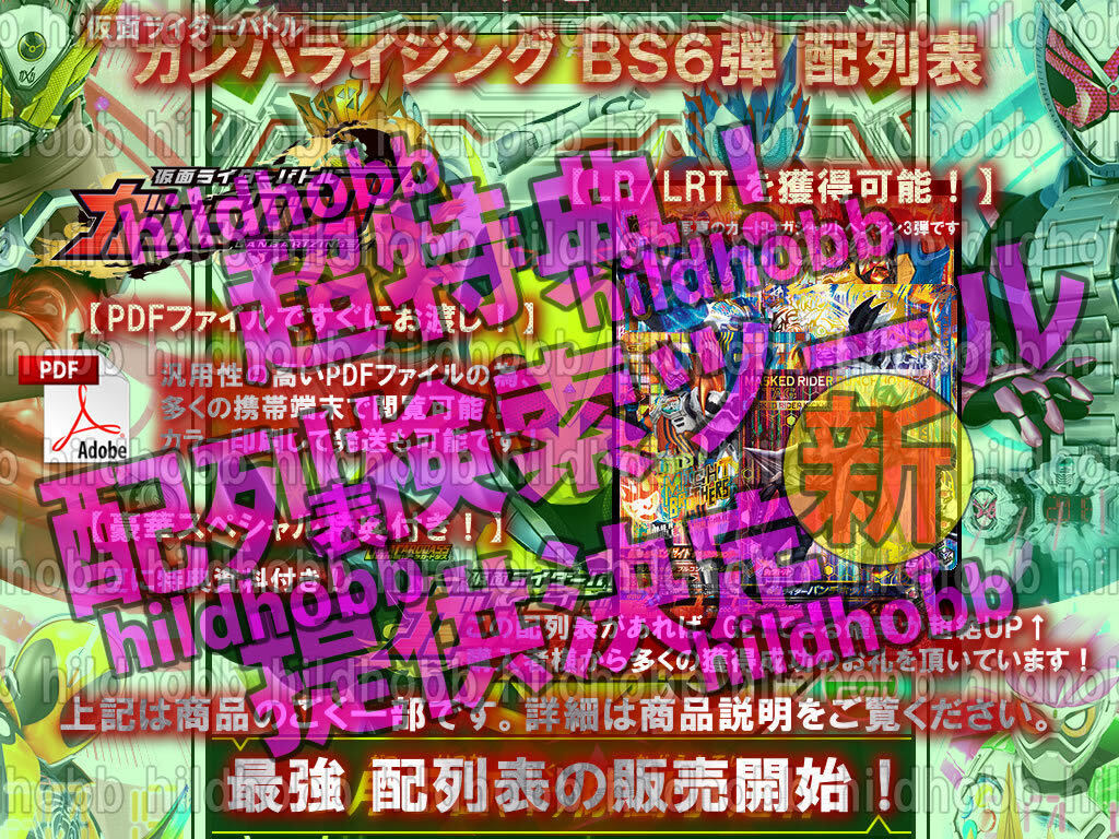 | ◆◆◆商品説明◆◆◆ 仮面ライダーバトル ガンバレジェンズ 最新弾 クロマティックX4弾 配列表検索ツール 毎弾の実績通り、 稼働日[9/11(木)]午前中にサービス開始予定! [新機能] 以下5点の新たな機能を配列表検索ツールに搭載! 1.レアリティ検索 - NやRやSRやCP等のレアリティレベルでも検索が可能となります - 2.過去弾検索 - 過去の弾もシリンダー別に検索が可能となります - 3.ランダム検索 - 排出候補が複数ある場合の箇所にも対応が可能となります - 4.検索履歴 - 過去に検索した内容を閲覧および一括再セット検索が可能となります - 5.更に完全オリジナルの超革新的新機能 - 上記全ての新機能よりも更に革新的なオリジナル新機能を追加します - 今までの配列表検索ツールが上記の新機能の搭載により、劇的にパワーアップします! 【配列表検索ツール ガンバレジェンズ クロマティックX4弾】 配列表検索ツールは、排出されたカード番号を入力するだけで、 瞬時に一致する配列表の箇所を検索し、次のLLR、LRが排出されるまでの回数を表示します。 当ツールはスマートフォン端末やタブレット端末での操作となりますので、筺体の前で配列表を広げたり配列表と何分間もにらめっこする必要が無くなります。 非常に直感的なツールですので特に説明も必要なく簡単に操作することが可能です。 また転売対策にも大きな役割を果たします。こちらが作成した配列表の転売行為により、 落札者様から『段々と同じ配列表を持っている人が多くなって既にLLR、LRが抜かれた後の事が増えてきた』といった声が多く聞かれるようになってきました。 悪質な転売行為により、出品者だけではなく落札者様の利益にまで影響が出る深刻な事態となっていました。 当ツールは転売や盗作を阻止する機能を搭載しておりますので、可能な限り落札者様の利益をも確保することができる最良の環境構築を実現しております。 過去毎弾、最多パターン及び最速配信を実現してきた当方だけが唯一提供できるWEBツール商品です。 購入希望者様は今まで以上に、こちらの配列表の転売品や模倣したツール商品の購入にご注意下さい。 【実績】 CX3弾 12パターン CX2弾 12パターン CX1弾 12パターン SC6章 12パターン SC5章 12パターン SC4章 12パターン SC3章 12パターン SC2章 12パターン SC1章 12パターン GL5弾 12パターン GL4弾 12パターン GL3弾 12パターン GL2弾 12パターン GL1弾 12パターン GG3弾 12パターン GG2弾 12パターン GG1弾 12パターン その他の過去弾も全て最多パターン その為、今後はPDFファイルやネットプリントよりも、優先してサービスを提供する予定です。 ※PDFファイルやネットプリントに関しましても、今まで通り最多と最速でお渡し予定なのでご安心下さい。当ツールではそれよりも更に優先する可能性があるということです また、当ツールへの完全移行も視野にいれておりますので、是非、スタート間もないこの機会に使いこなして差を付けて下さい。 今後も更なる充実した機能や当方にしかできない驚きの新機能を続々と実装予定ですので、そちらもまた楽しみにして下さい。 今までの完成度の高いPDFファイル形式に慣れ過ぎ、実際に試しもしないで当ツールを拒否することは、非常に損だと断言します。 | ||