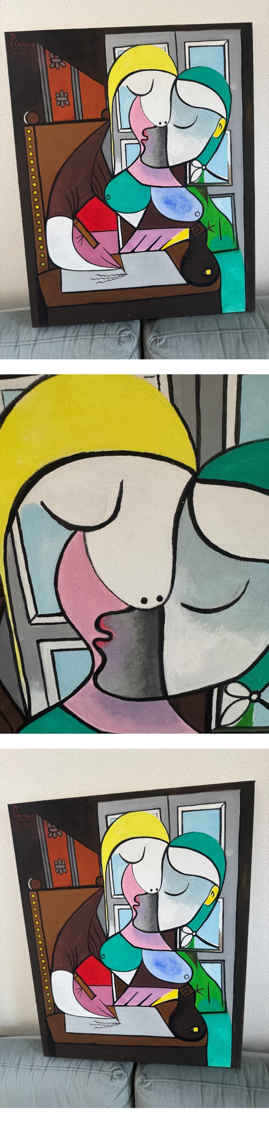 | 【特別出品】パブロ ピカソ Picasso 手書き 貴重肉筆「手紙を書く女性(マリー・テレーズ)」習作 油彩画 裏にもサイン「模写」 | |||