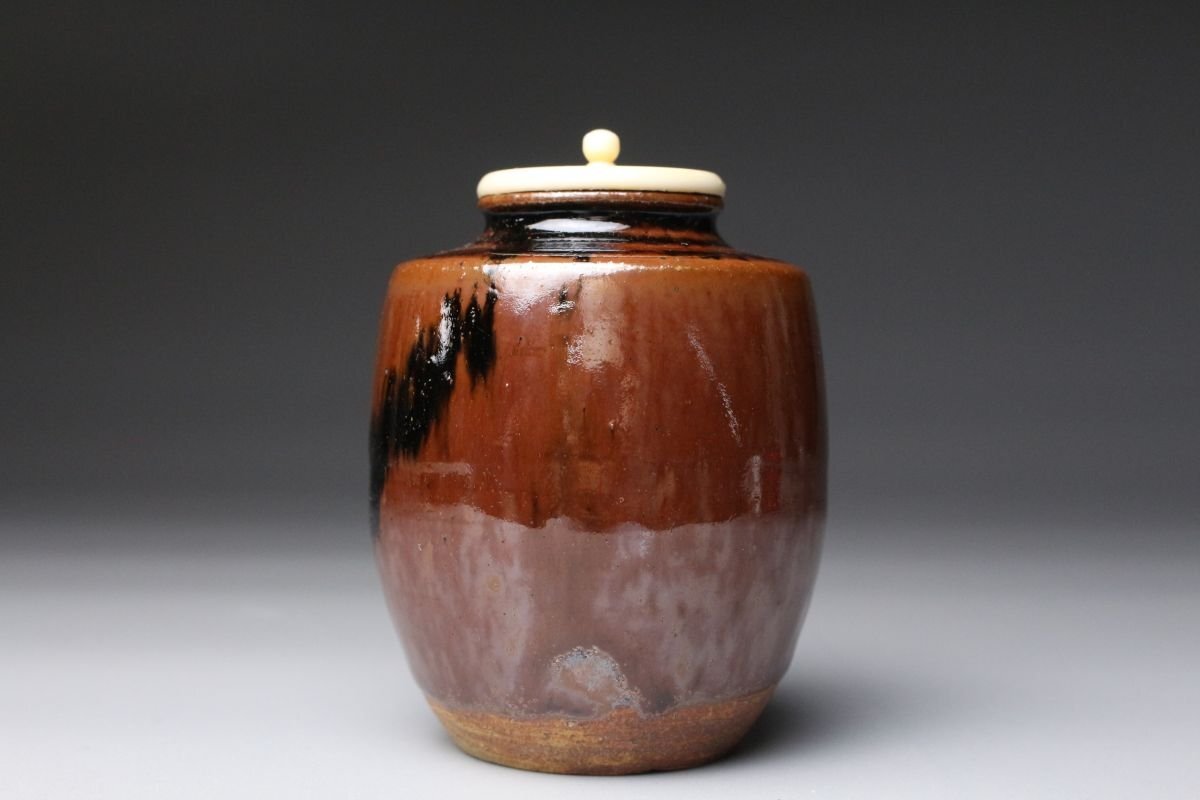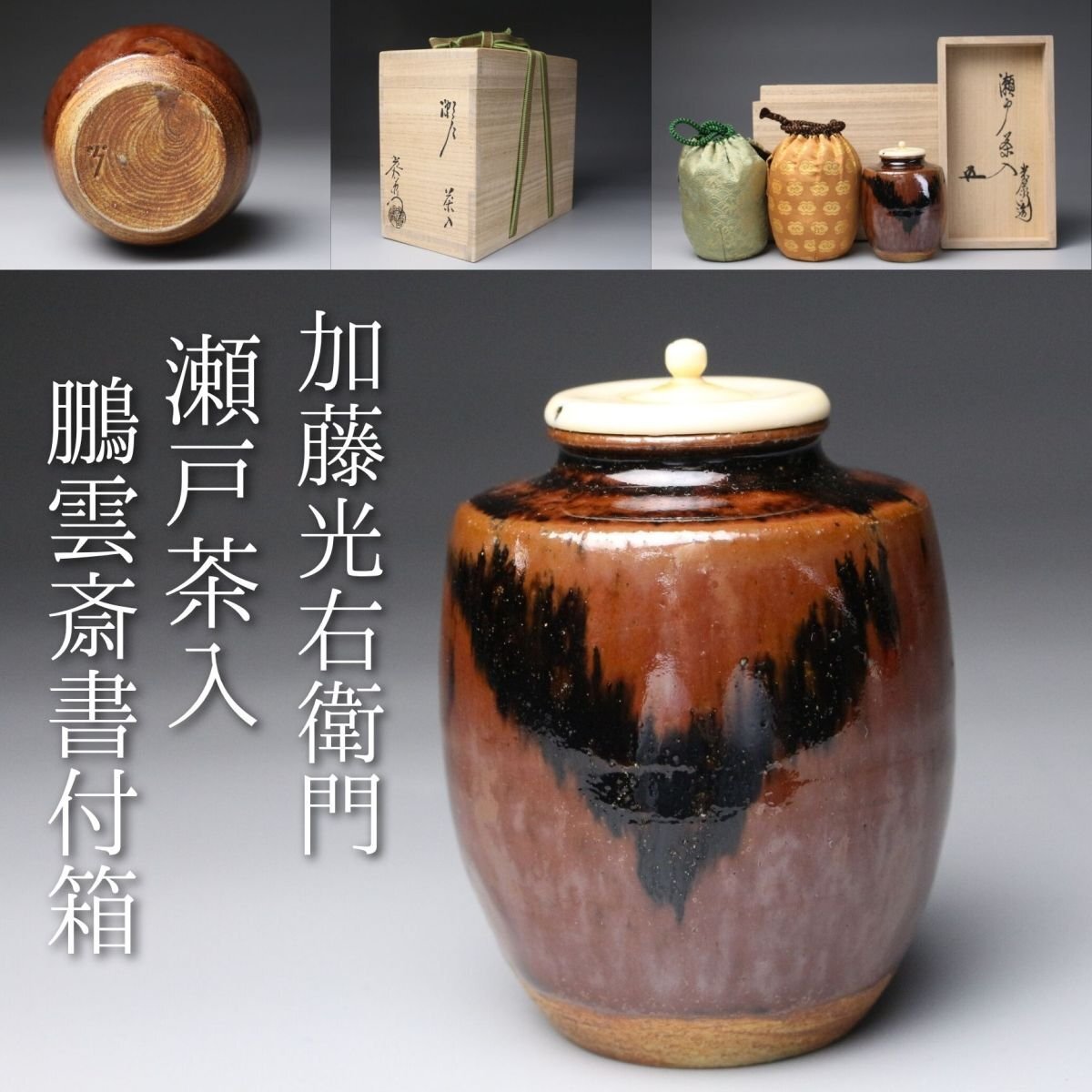[.RE]25.10 25102234A| * * * 商品詳細 * * * ここでしか出逢うことのできない唯一の美をご紹介させて頂きます。 本物保証致します。 加藤光右衛門 作 瀬戸茶入 鵬雲斎書付箱 瀬戸の土が語りかけるような温かみと、 茶陶本来の厳かな美が響き合う、加藤光右衛門の真骨頂ともいえる一作です。 加藤十右衛門の次男として生まれ、兄弟で切磋琢磨しながら名を馳せた加藤光右衛門。 若くして父に師事し、炎と土の理を体得、やがて自らの窯を築き上げ、 美濃伊賀・黄瀬戸・黒織部といった伝統の様式を現代に昇華させました。 この瀬戸茶入は、彼の作品に通底する「静謐と雄渾」が見事に調和した逸品。 端正な肩の張り、柔らかくも芯の通った景色、 そして鵬雲斎宗匠の書付箱と虫喰蓋、仕覆二揃いという完璧な装いが、 まさに格調高い茶陶の世界を体現しています。 見れば見るほどに深まり、手に取るほどに味わいが増す―― この茶入は、加藤光右衛門が土と炎に託した“心の景色”そのもの。 現代の名工が織りなす、伝統と精神の調和を感じさせる傑作です。 この機会に是非ご堪能下さい。 ■商品内容/ 茶入、仕覆、共箱 ■サイズ/横6㎝×高8㎝ 箱:横8.5㎝×高13.5㎝×奥行16㎝ ■状態/ スレ、小傷、箱にスレ、小傷、汚れがございます。 ※写真にてご確認、ご了承の上ご入札下さい。