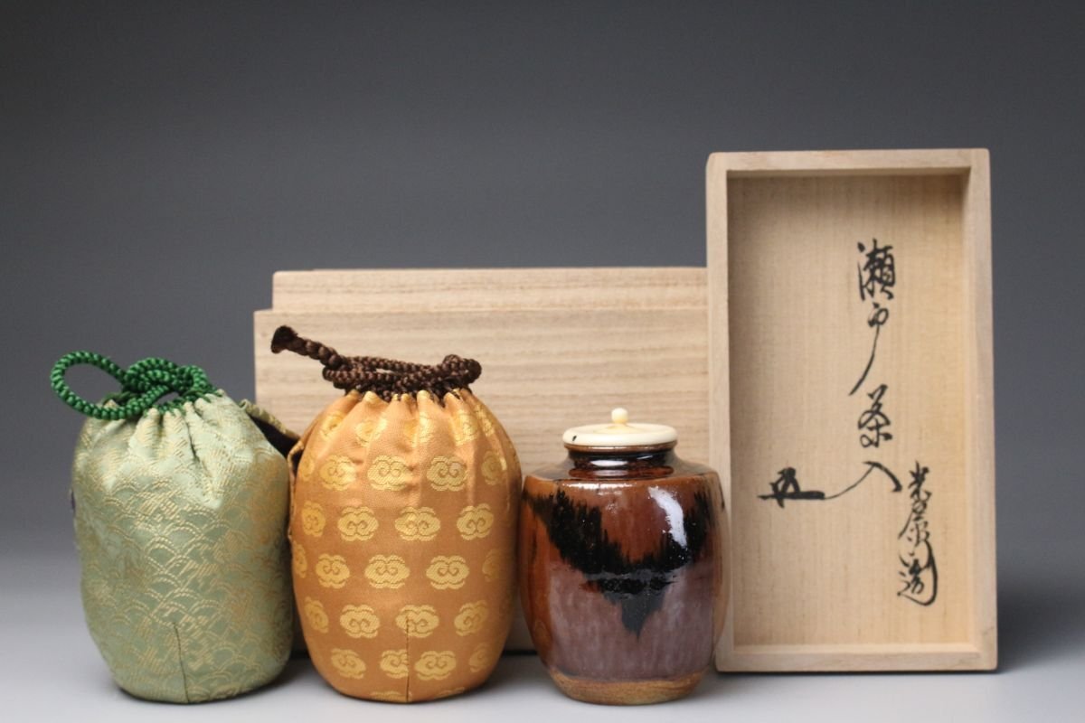 【LIG】本物保証 加藤光右衛門 瀬戸茶入 鵬雲斎書付箱 仕覆二揃い 虫喰蓋 茶道具 数奇者収蔵品[.RE]25.10 收藏