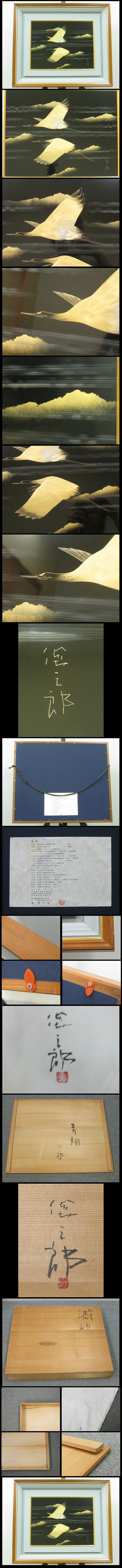 【心庵】額装 輪島塗 角偉三郎 沈金 鶴図 共箱 共布 日展会友 A1019 收藏