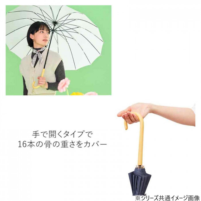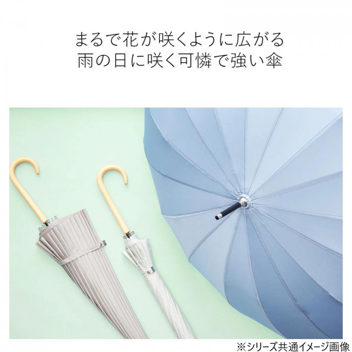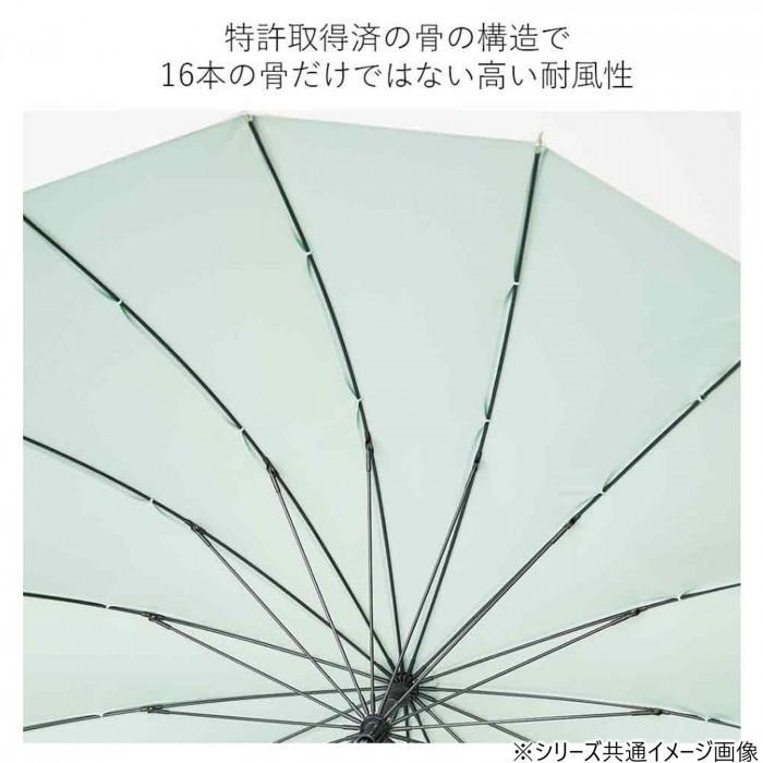 | 16本骨でシルエットも美しく、風にも強い傘です。しなやかなグラスファイバー骨を使用。1本の受骨が2本の親骨を支えることで高い耐風性を実現しました。 ※サイズは目安となります。 ※PC画面などの違いで色味が多少異なる場合がございます。予めご了承ください。 |