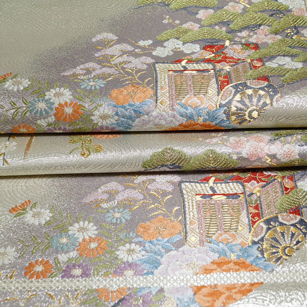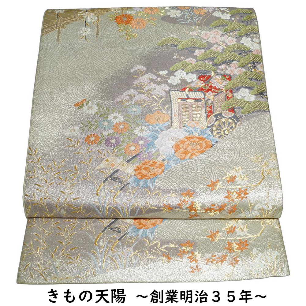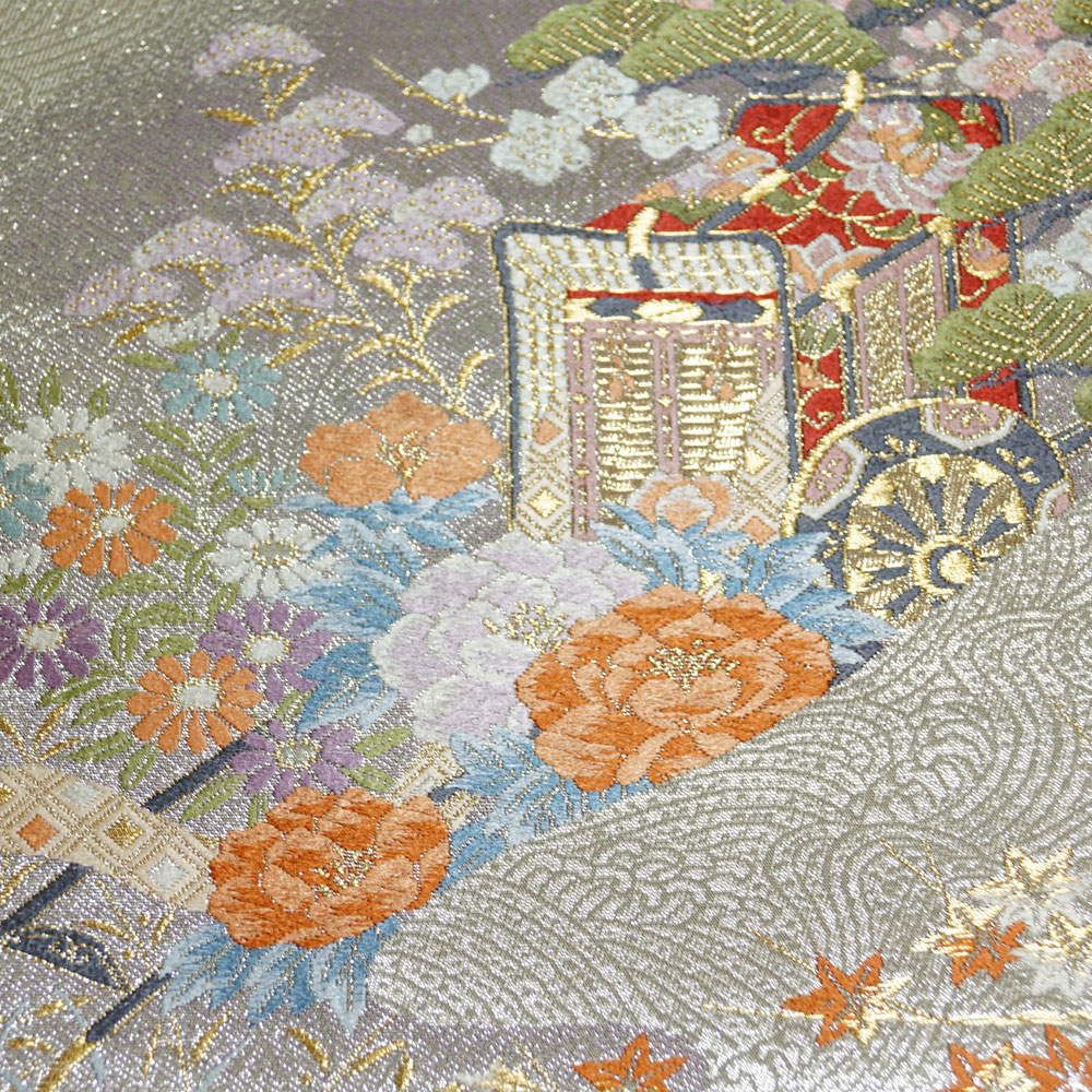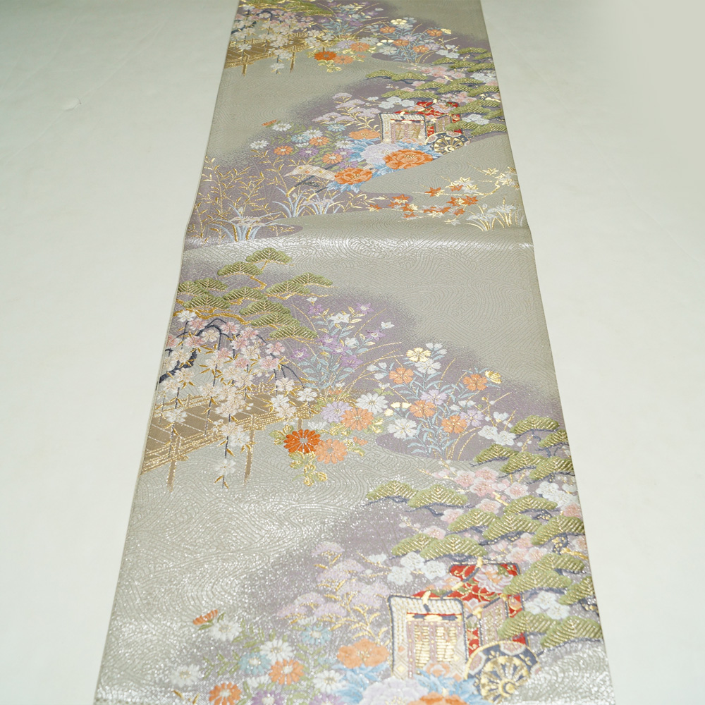 | 商品 説明 | 波頭模様の地織が施された銀色系の地に御所車に春秋の百花などの模様が織られた袋帯です。 |