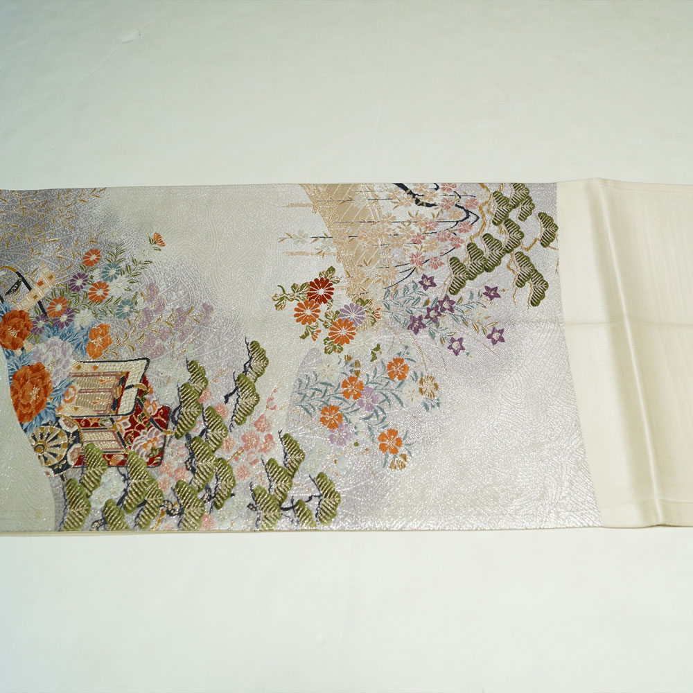 袋帯 未仕立て品 難有品 着物リメイク・リフォーム用 御所車に春秋草花模様 銀色系 正絹 中古 リサイクル着物 帯 フォーマル 着物 天陽 收藏