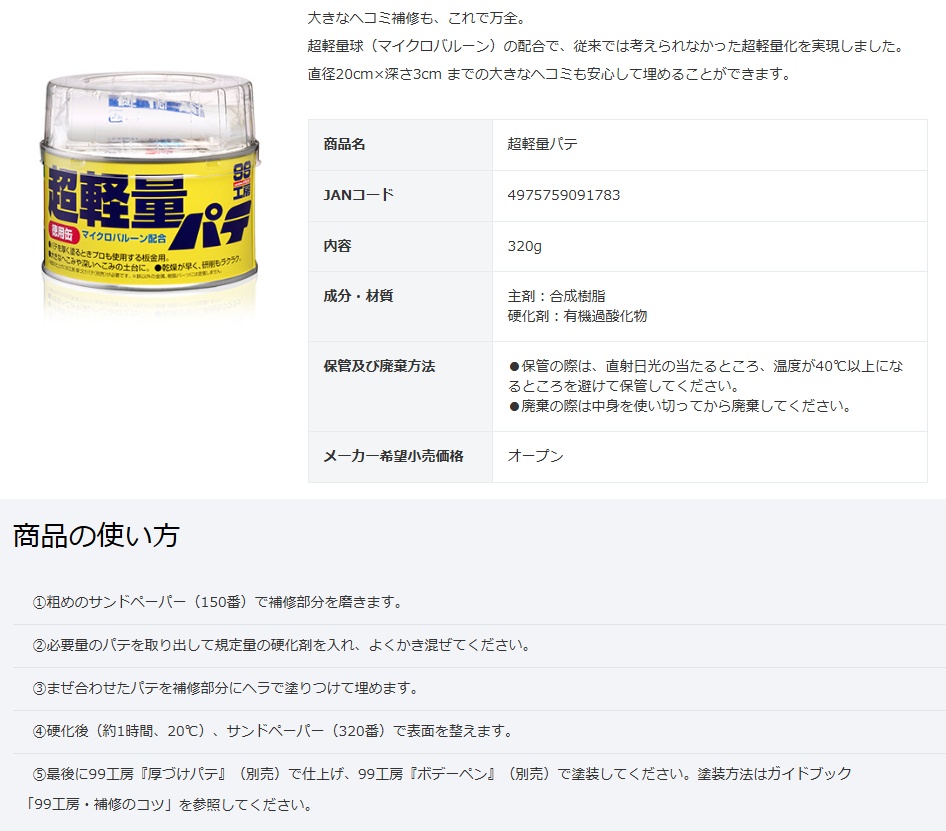ソフト99 超軽量パテ 320g 商品コード09178 自動車のボディのへこみ、補修用 SOFT99 在庫 收藏