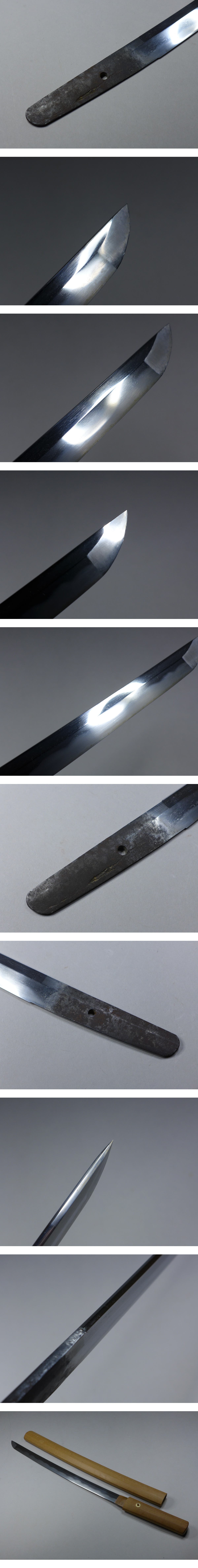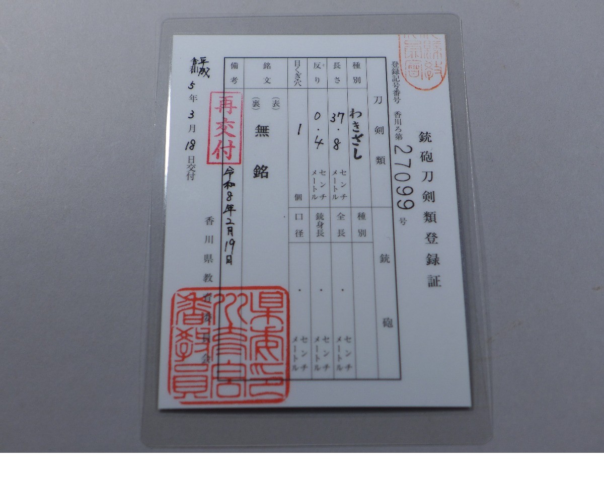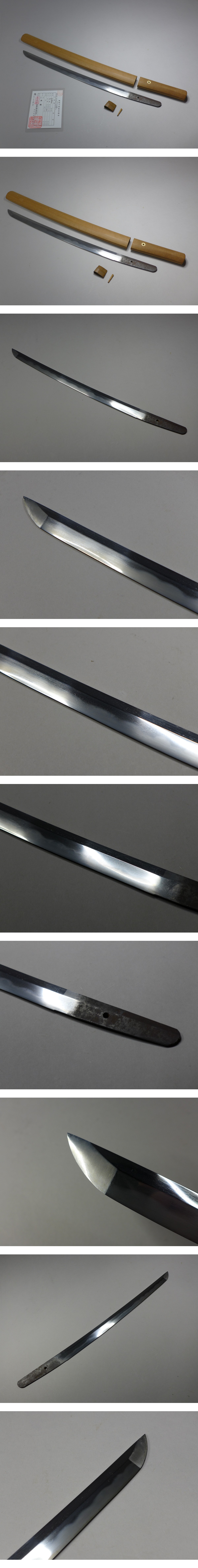 詳細サイズは画像の登録証をご覧下さい。先幅:約20mm。元巾:約30mm。先重:約4・4mm。元重:約5・9mm。刀身重量:約336g。当方このような物に詳しくない為に詳細などは分かりかねます。状態は画像参照でお願いします。ご了承の上お願いします。★★★落札者は、落札して購入後、銃砲刀剣類所持等取締法に もとづき都道府県の教育委員会に所有者変更の届出が必要です。★★★★★★★★★★★★★★★★★★★★★★★★★最近、悪質な入札者が多く非常に迷惑をしております。新規IDや「非常に悪い・悪い」の評価の多い方の入札はお断りさせて頂きます。 仮に入札があった場合でも、発見次第入札を削除させて頂く場合がございます(判断基準は弊社判断によります事予めご了承下さい。