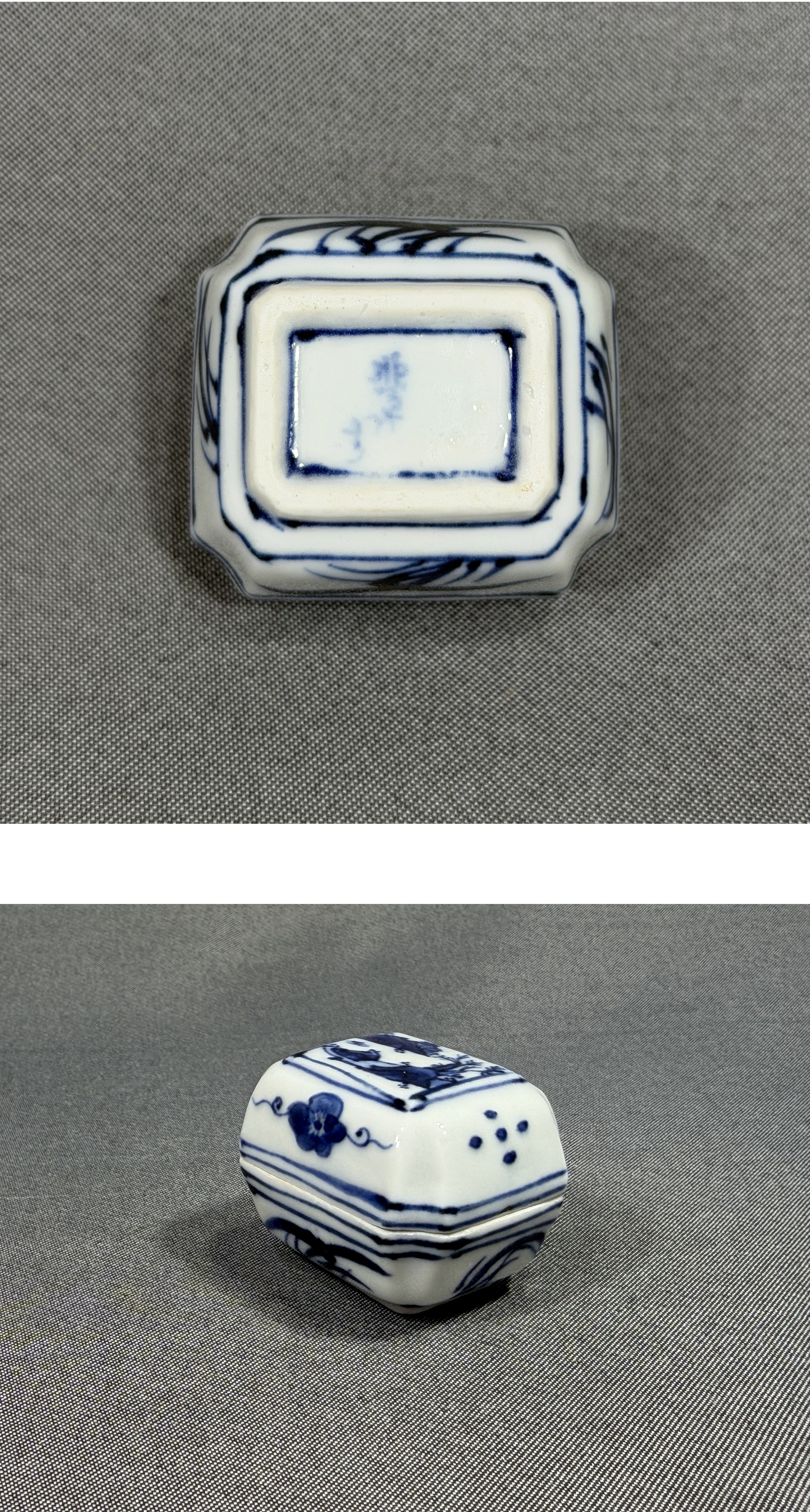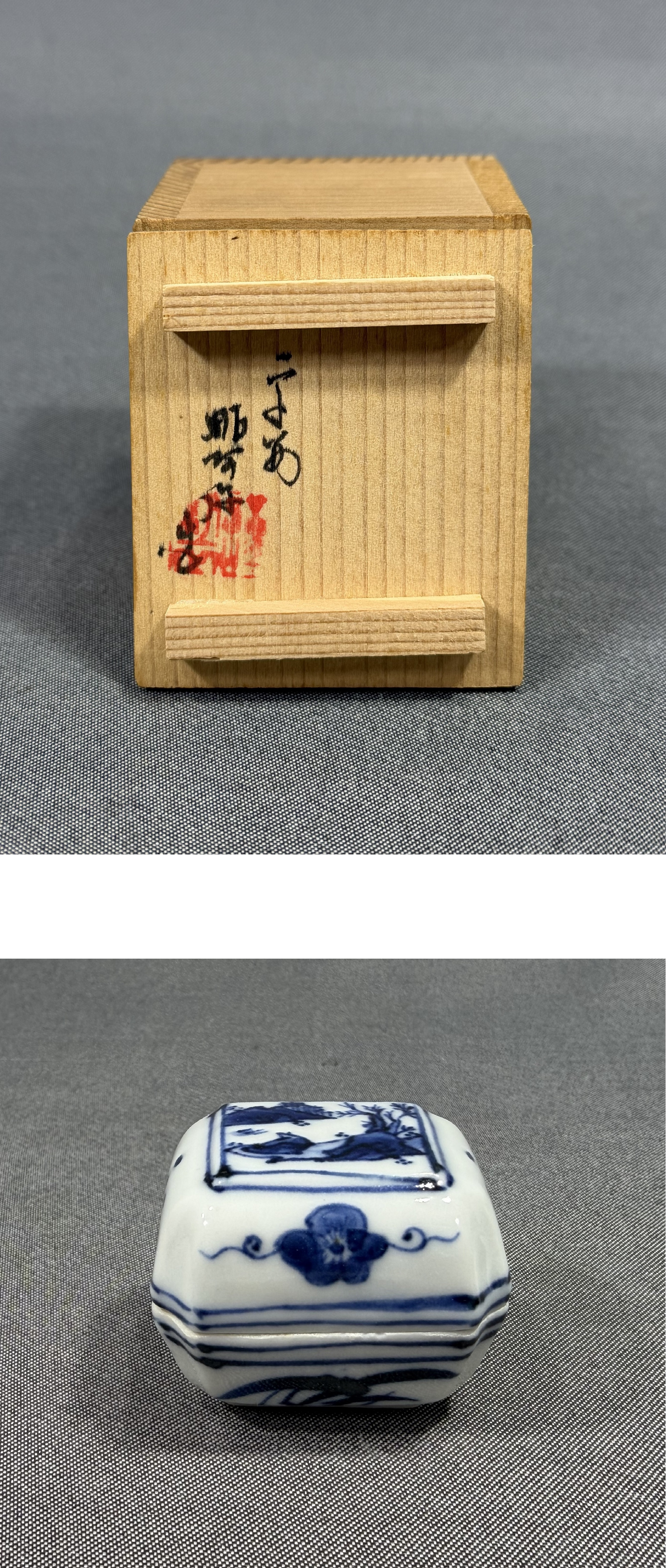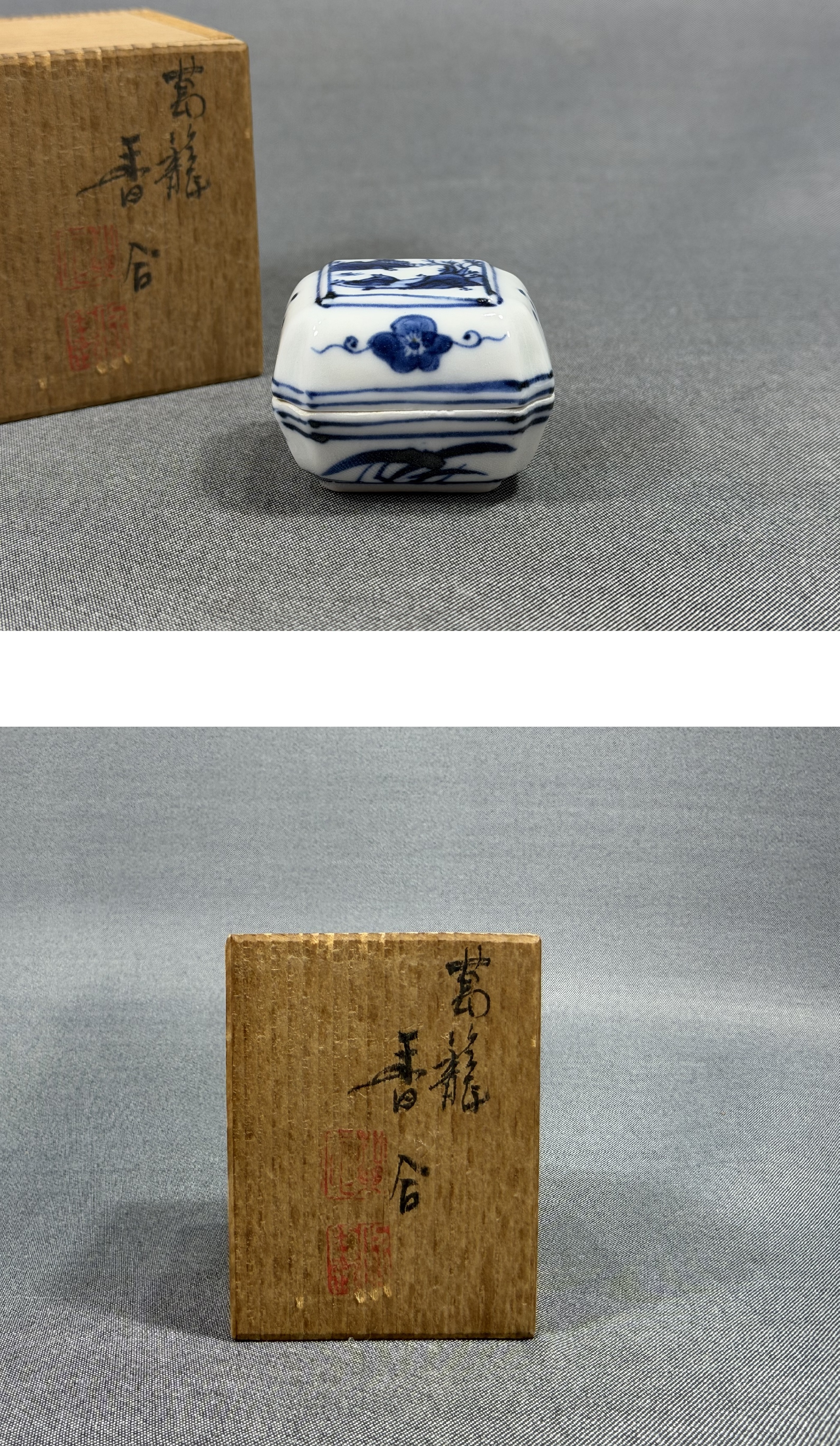 【風車】京焼名工 平安 【高野昭阿弥】作 染付 山水 蘭絵 葛籠 香合 ▲共箱 在銘▲茶道具 骨董品 古美術 收藏