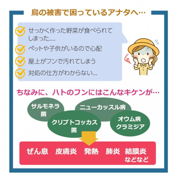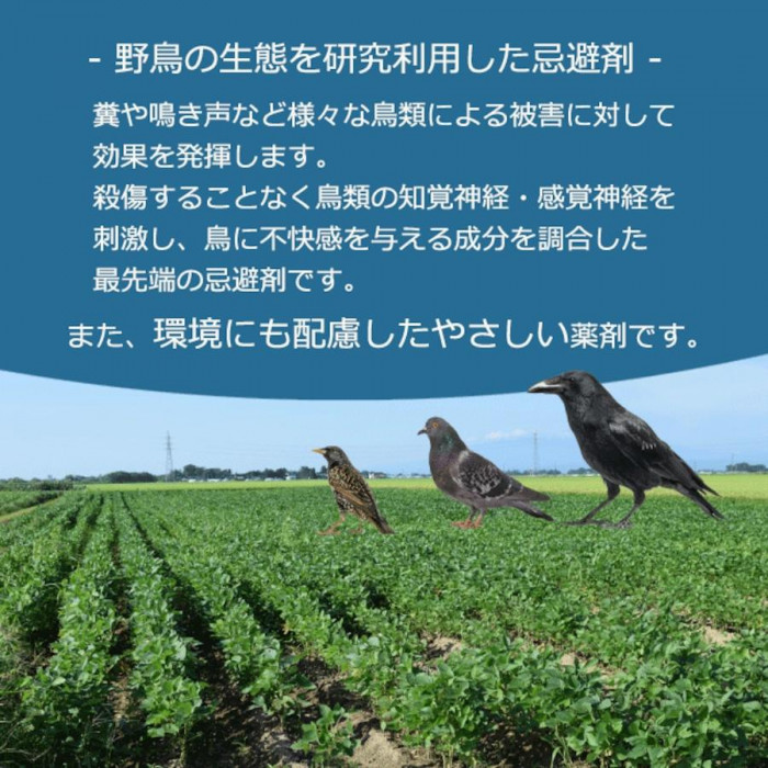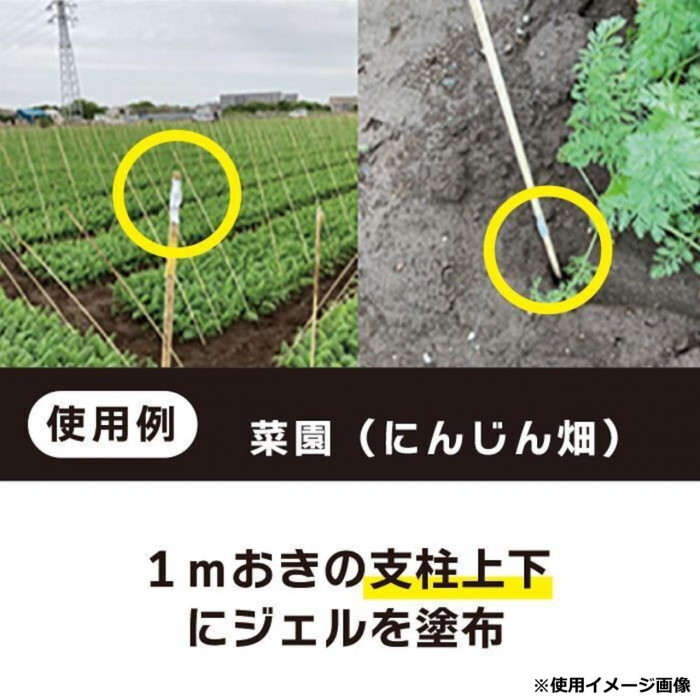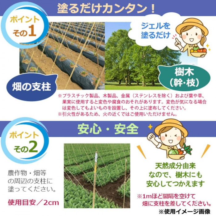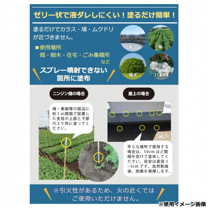 | 毎日のフン掃除や、収穫間近の作物を狙う鳥たちに悩まされていませんか?そんなあなたにおすすめしたいのが、設置するだけで鳥を寄せつけない「ニッショウ鳥よけジェル」。ハト・カラス・ムクドリ・ヒヨドリなど、あらゆる鳥類の被害に対応できる本製品は、農家の方にも、ベランダや庭まわりの鳥害に悩む一般家庭にも幅広く支持されています。 設置方法はとても簡単。 近寄らせたくないところに塗るだけ!(畑の支柱など) ジェルから放たれる天然成分ベースのニオイが、鳥にとって不快な空間をつくり、近寄るのを防ぎます。 さらに、このジェルは目立ちにくく、設置しても景観を損なわないのが大きな魅力です。 最長約3ヶ月効果が持続するので、手間をかけることなく「毎朝の掃除がなくなった!」といった嬉しい声も多数届いています。 【使用方法】 樹木の幹、コンクリート、アスファルト、ステンレス、ガラス、タイル等に塗布してください。 効果がうすれてきたときは、再度塗布してください。 ※使用目安は1ヶ所あたり2~3g(約3~4cm)です。 【使用上のご注意】 ※壁や手すり、プラスチック製品、木製品、金属(ステンレスを除く)および葉や草、果実に使用すると変色や腐食のおそれがあります。材質が不明なものには使用しないでください。変色が気になる場合は廃材などを設置し、その上に塗布してください。 ※引火性があるため、火の近くではご使用いただけません。 ※使用場所・使用環境により忌避効果に差があります。 ※鳥よけシリーズおよびネズミよけシリーズは鳥類やネズミの被害対策を目的とした忌避剤です。 ※鳥やネズミが一切近づかなくなるものではありませんのでご了承ください。 |