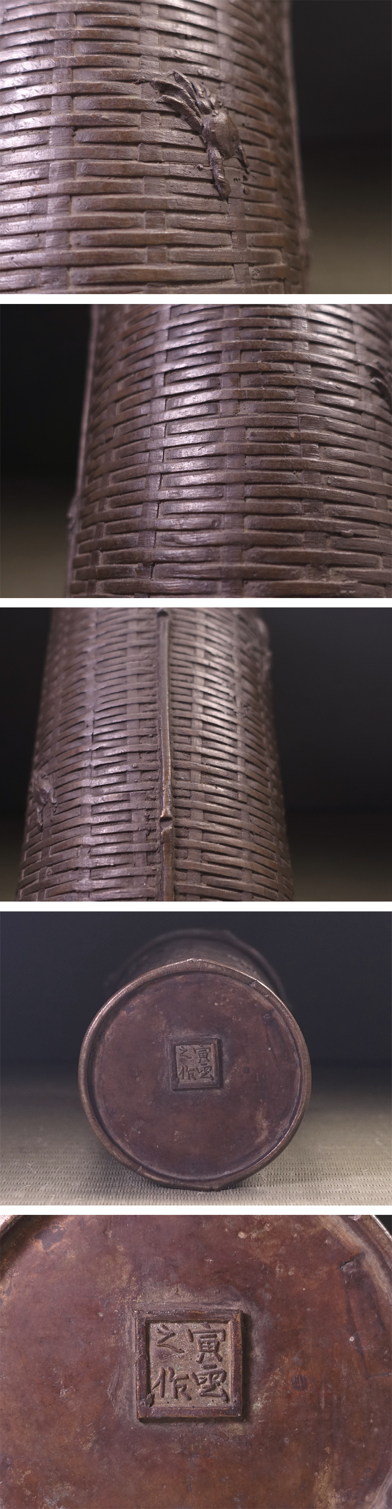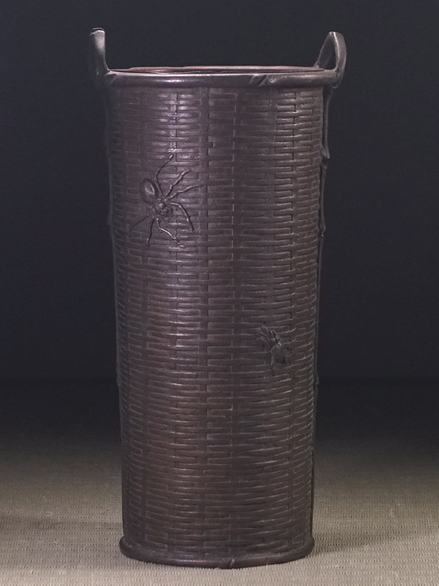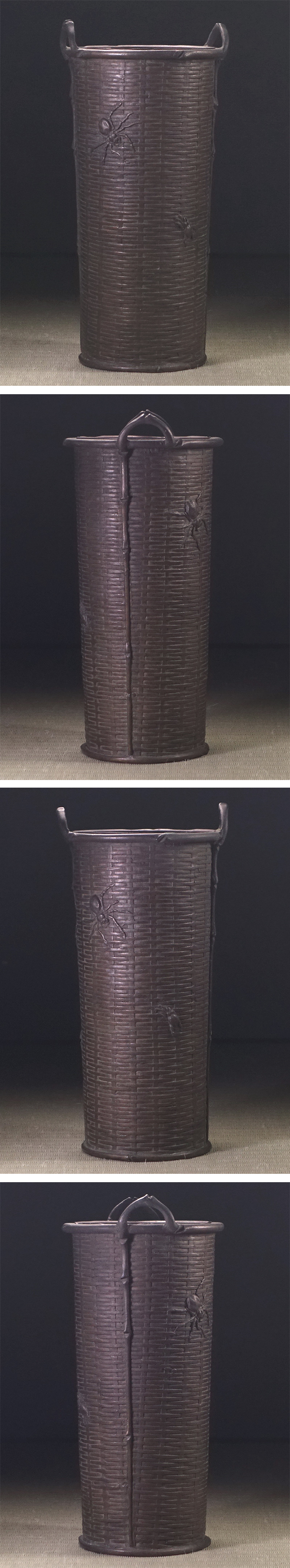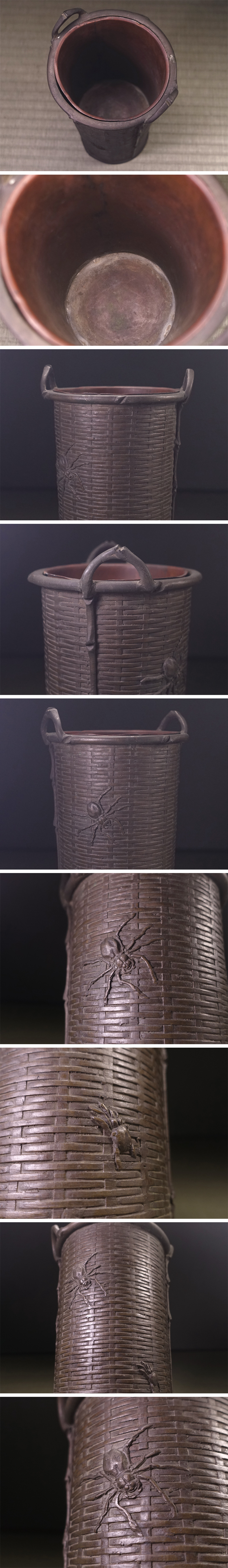∇花∇【金工師寅雲】作 銅製蜘蛛這竹組花籃 竹花籠を模した時代金工の秀作 收藏
