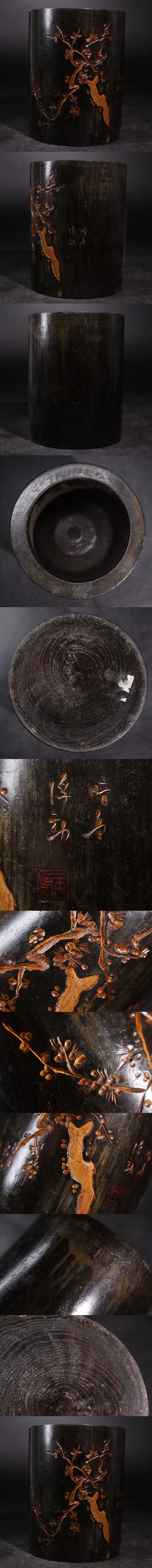 | 在銘 木製 梅花彫 筆筒 / 木彫 木工 筒 文房具 文房四宝 書道具 煎茶飾 .G3959 |
