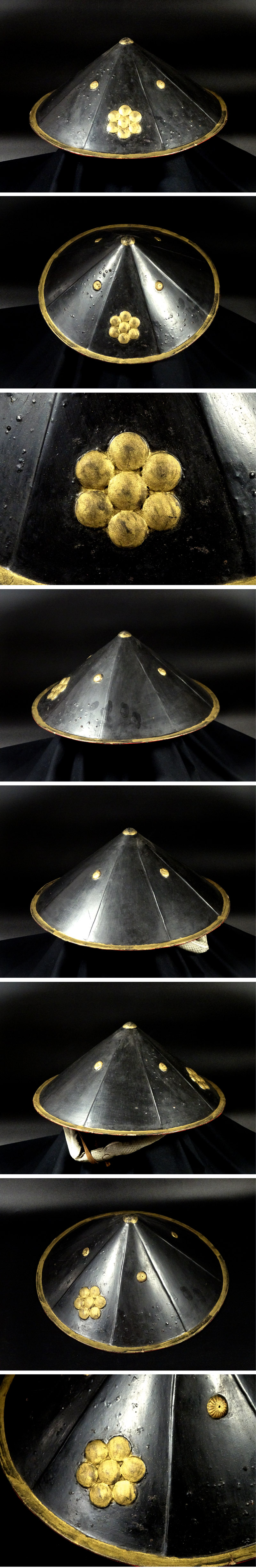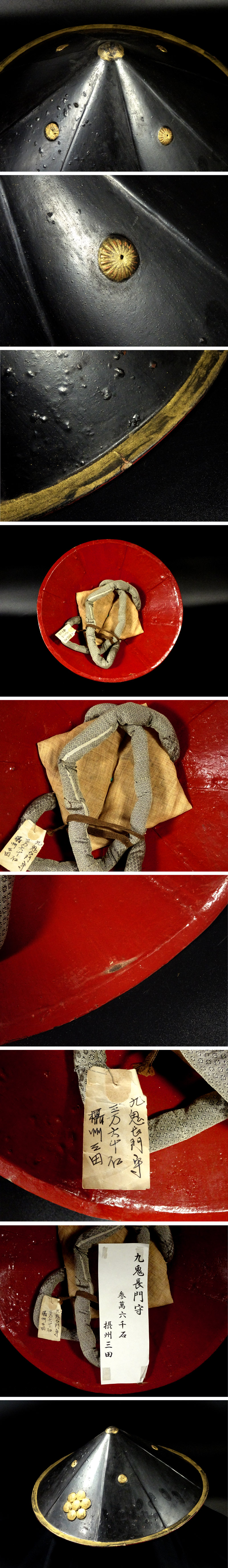敬逢 江戸時代 摂州 三田藩 九鬼家伝来 鉄地 八間 黒漆塗 本金彩 七曜紋 陣笠 内朱塗 甲冑武具鎧兜 13 【検明珍早乙女面頬 收藏