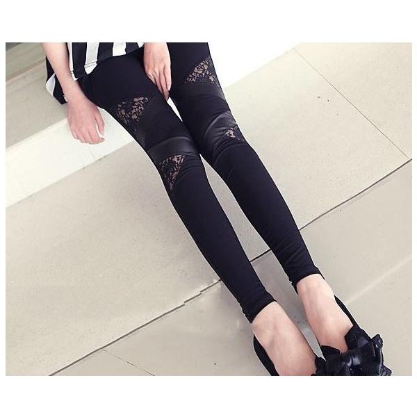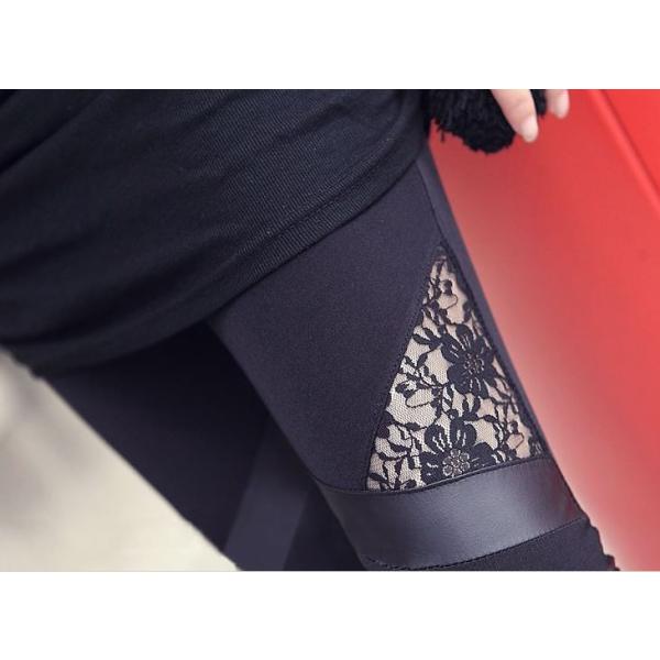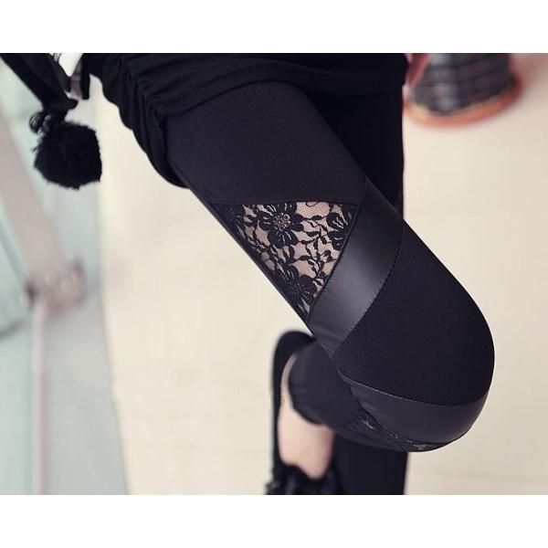 ワンポイント レザー & 花柄レース 美脚 レギンス ブラック 收藏