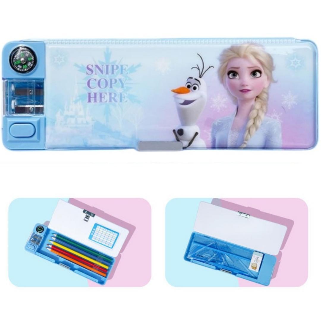 ディズニー映画「アナと雪の女王」が描かれた、鮮やかでかわいらしい筆箱です。表面にはエルサの姿が鮮明に描かれており、フタにはユーモアたっぷりのオラフのキャラクターが描かれています。鮮やかなパステルカラーのデザインが、同作品の冬の世界観を思わせるスタイリッシュな仕上がりとなっています。