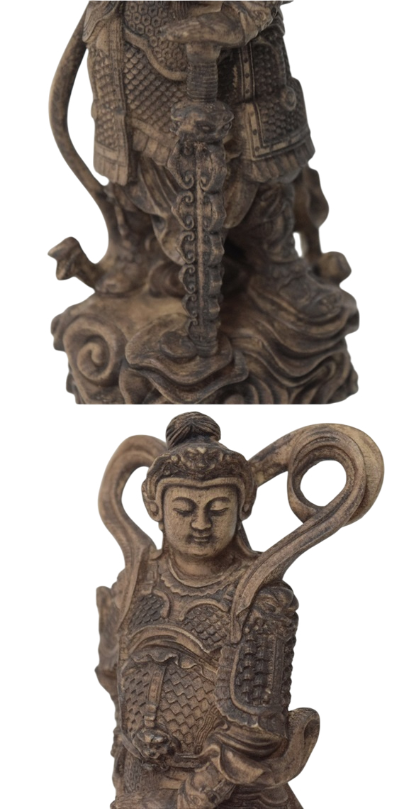 総サイズ:高さ:約16.3cm 下辺の横:約6.3cm 下辺の最大の厚み 約5cm 彫り:手彫り&機械彫り 素材:桧木 *手作業にてムラ染めを行っているため、一体一体染まり方が違いますのでオンリーワンの仏像を楽しむことができます。また経年によるかっこいい雰囲気を出すために傷加工を施していますのでアンティーク仏像が好きな方におすすめです |