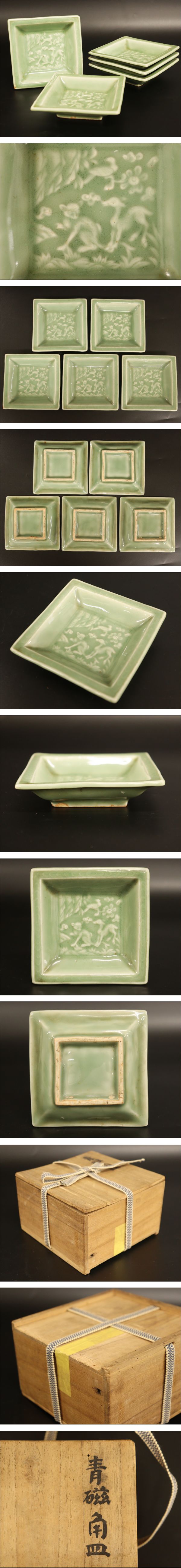 【行董】青磁 猿鹿鳥文 角小皿 五客揃い 径10.8cm 銘々皿 組皿 箱付き 陶磁器 美術品 陶芸 骨董品 骨董美術 AT575ABC06 收藏