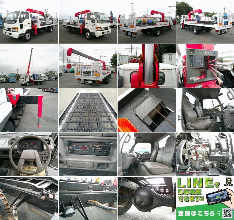 クレーン付きセルフローダー 上物:古河ユニック製 上物同年式 3段ブーム ラジコン付(無線) 2.9t吊 フックイン 荷台寸:599×215 積載2.6t セーフティローダー(スライドボディ) ウインチ付 走行17万㎞ 5速ミッション 中型(8t限定)免許対応車 タイヤサイズ:225/90R17.5 |