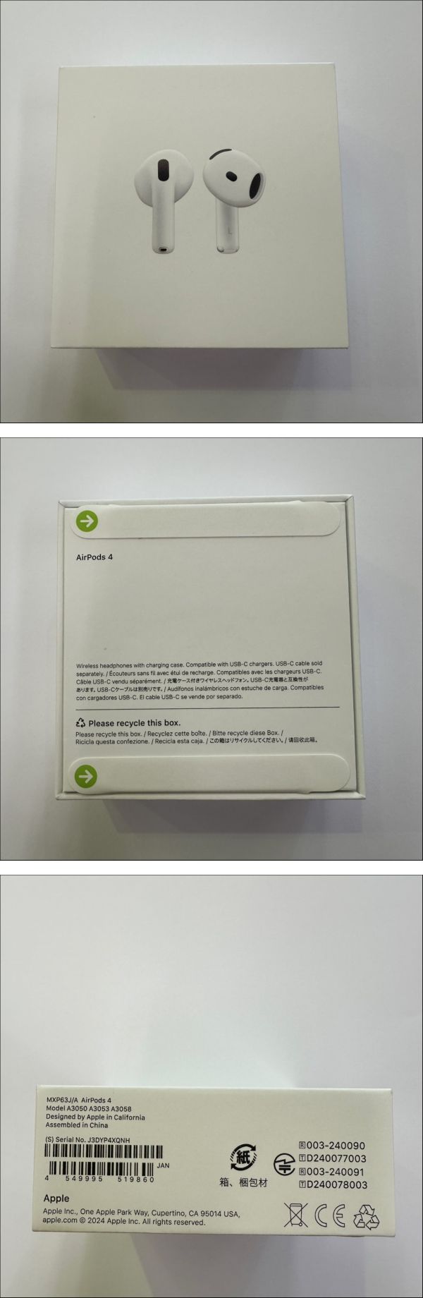 ☆★☆★☆ご入札前に【ご利用規約】を必ずお読み下さい☆★☆★☆★ 【新品】 Apple AirPods 4 エアーポッズ 4 MXP63J/A 第4世代 A3050 A3053 A3058 ワイヤレスイヤホン アップル【未使用】 【状態】 (新品/未使用) シリアル[J3DYP4XQNH] 詳しくは、添付写真を参照して下さい。 。 ※ノークレーム、ノーリターンでお願いします。 ☆★☆★☆ご入札前に【ご利用規約】を必ずお読み下さい☆★☆★☆★ | ||