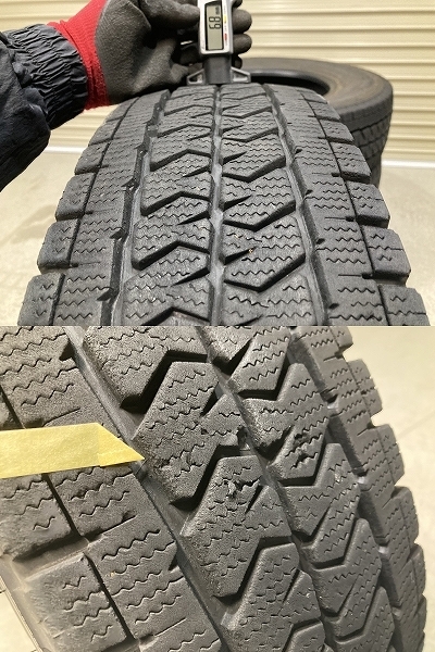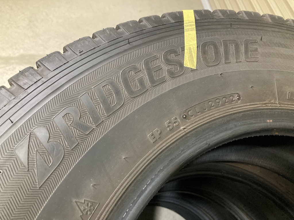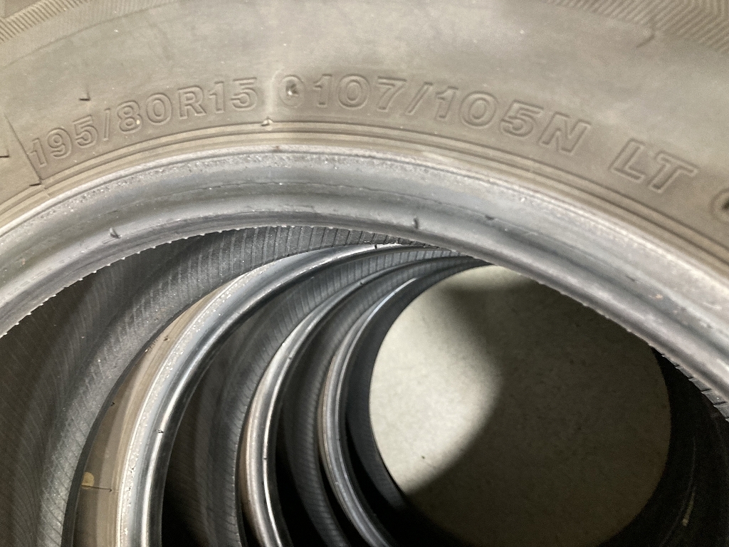 〇タイヤ情報 BRIDGESTONE BLIZZAK VL10 ・サイズ 195/80R15 107/105N LT ・製造年 2022年 ・本数 計4本 ・残溝 約7~7.5分溝(センター付近測定時) ・状態 1本の接地面1か所にえぐれ傷がありますので画像にてご確認ください。 エア漏れ、パンク修理痕、ビード切れはありません。 | ||||