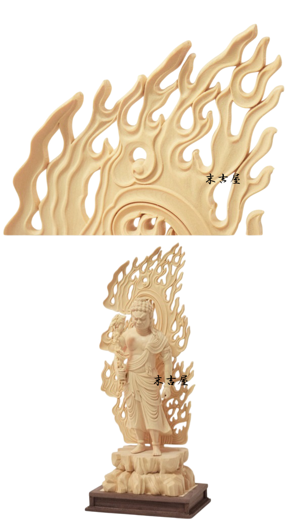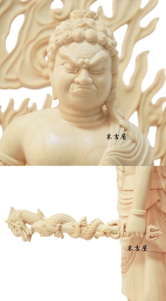 五大明王の中心人物と言われる不動明王。 悪を絶ち、仏道に導くとされてることから主に戦闘のみと思われがちですが役目はそれだけではなく人の迷いや煩悩を断ち切り導いてくれる慈悲深い一面も併せ持つのも魅力の不動明王。 全て込みの総サイズ:高さ:約46cm 下辺の横:約18.9cm 下辺の厚み 約13.2cm 彫り:手彫り&機械彫り 素材:桧木 *自然素材を使用しているため一点一点木の模様や黒点などが若干違います *日本国内に在庫を持ち日本人が染めと検品と梱包と発送手続きと最終仕上げをしてます |