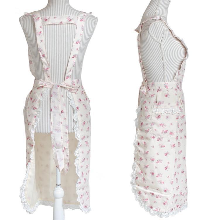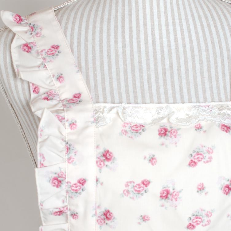 小ぶりのローズをたっぷりちらし、まるでローズガーデンにいるようなデザインのエプロンです。フリル付きで、女性らしい柄でありながら可愛らしいアイテム。肩ひもがずれ落ちない仕様になっており、大きいポケット付きで機能性も◎