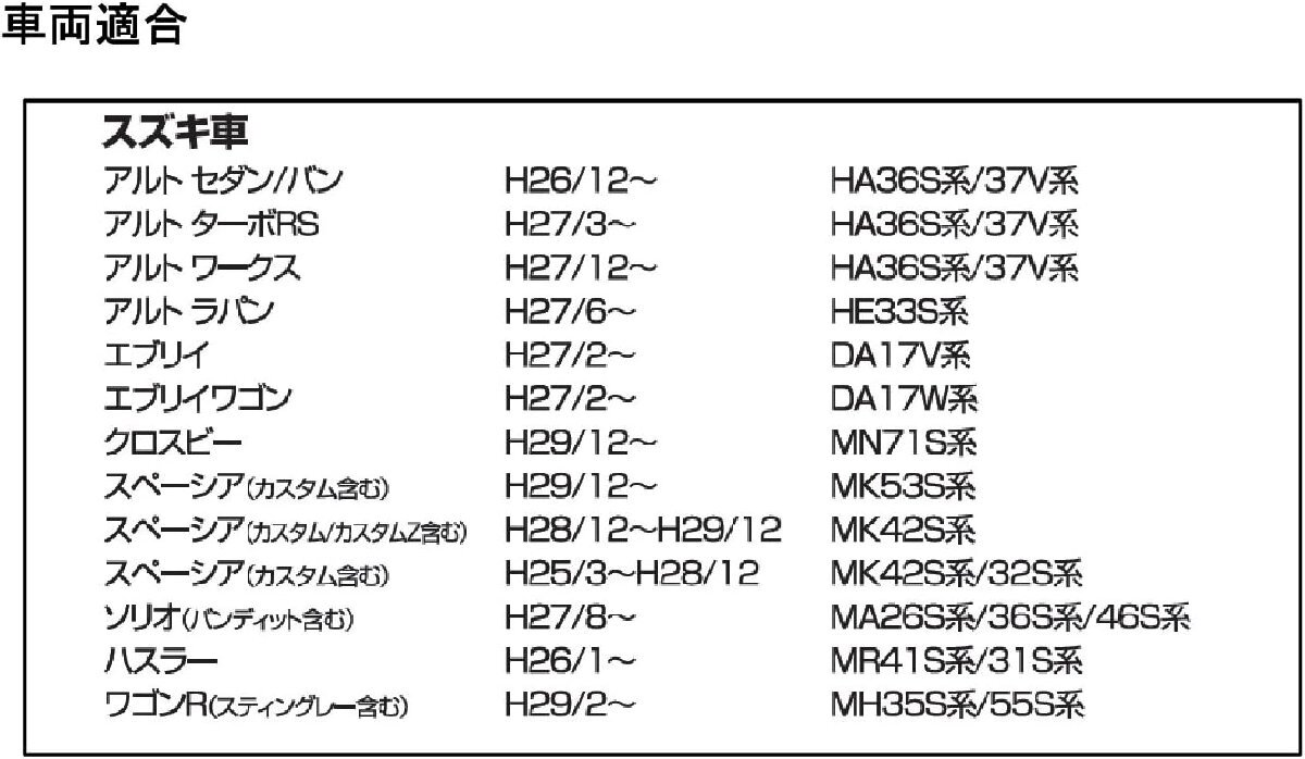 | ■メーカー : STREET ■商品名 : パイオニアナビゲーション・スズキ車用 ナビ & ステアリングリモコン ダイレクト接続ハーネス ■型 番 : AH-43 ■定 価 : ■状 態 : 未使用品 ------------------------------------------------------------ パイオニア (カロッツェリア) 製ナビゲーションをスズキ車に装着する為の取付ハーネスです。 車両純正ステアリングリモコンの接続にも対応しています。 車両、ナビとの接続部は全て専用設計のコネクタやピンジャックを採用している為、取付作業を簡略化します。 ケーブル長:270mm 【適合】 車両適合 アルト セダン/バン H26/12~ HA36S系/37V系 アルト ターボRS H27/3~ HA36S系/37V系 アルト ワークス H27/12~ HA36S系/37V系 アルトラパン H27/6~ HE33S系 エブリイ H27/2~ DA17V系 エブリイワゴン H27/2~ DA17W系 クロスビー H29/12~ MN71S系 スペーシア(カスタム含む) H29/12~ MK53S系 スペーシア(カスタム/カスタムZ含む) H28/12~H29/12 MK42S系 スペーシア(カスタム含む) H25/3~H28/12 MK42S系/32S系 ソリオ(バンディット含む) H27/8~ MA26S系/36S系/46S系 ハスラー H26/1~ MR41S系/31S系 ワゴンR(スティングレー含む) H29/2~ MH35S系/55S ナビ適合 パイオニア製 サイバーナビ AVIC-CW901(-M) / CW700(II) / CW900(-M)/ ZH0999WS / ZH0999W / ZH0777W / ZH0099W / ZH0077W / ZH0999LS / ZH0999L / CZ901 / CZ700II パイオニア製 楽ナビ AVIC-RW900 / RW300 / RW99 / RW33 / RW09 / RW03 / RL99 / RZ901 / RZ701 / RZ501 / RZ301 |