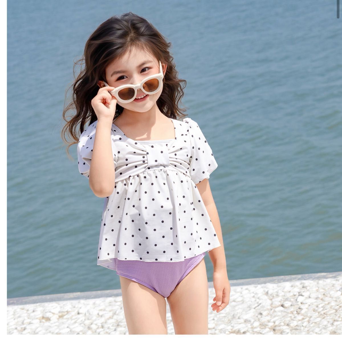 キッズ 水着 女の子 110cm ラベンダーピンク ドット 白 リボン セパレート かわいい 韓国 夏 海 プール 收藏