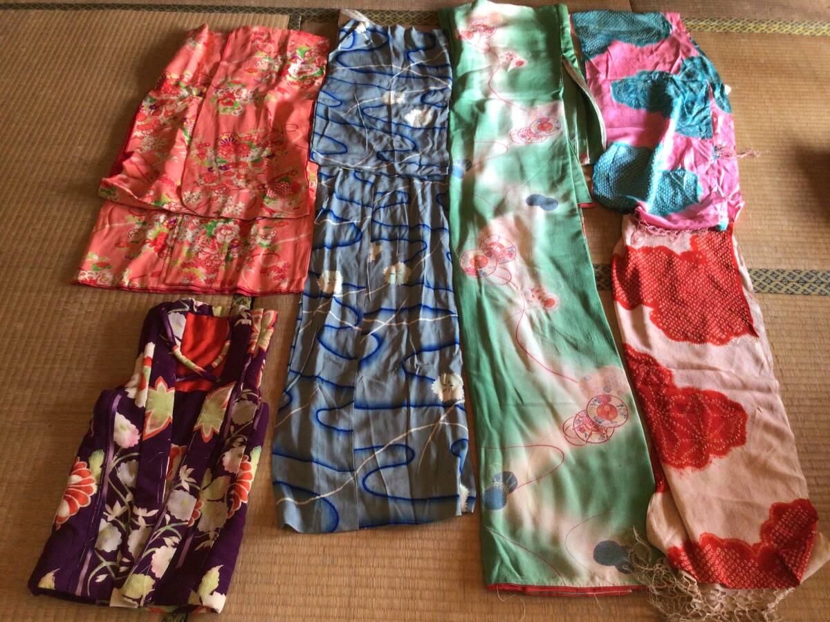 丈52~150センチあり、ちりめんの袖なし、縮緬襦袢、錦紗ちりめん長着、錦紗3つ身、錦紗ちりめんしごき2枚です。シミやよごれや小傷があります。