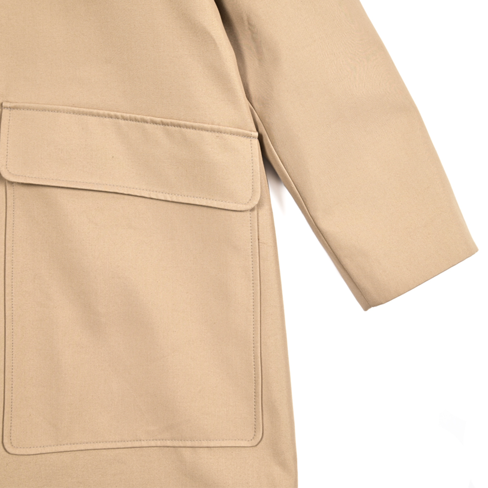 | ・ロング丈 ・ステンカラー ・フライフロント(比翼仕立て) ・フラップポケット ・インナーポケット ・インバーテッドタック ・ノーベント | |