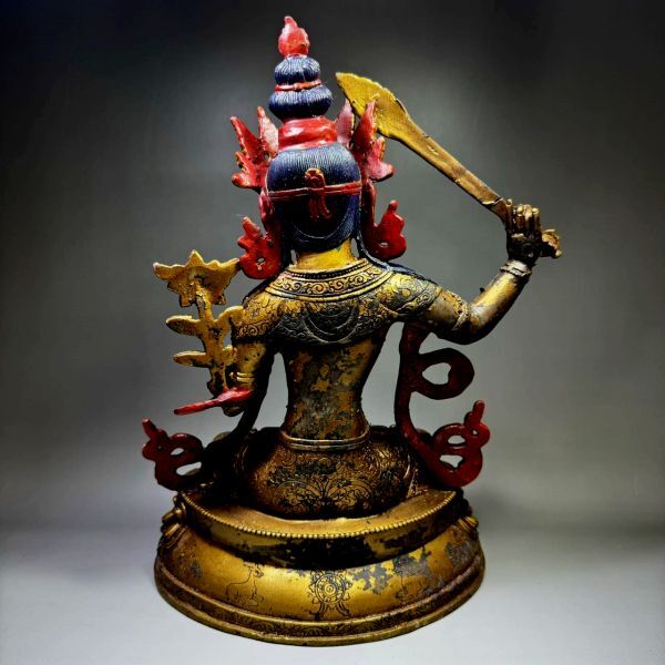 金銅細工 チベット密教 大迫力文殊菩薩座像高彫 鎮宅開運置物 極上質 高さ約 32.5cm