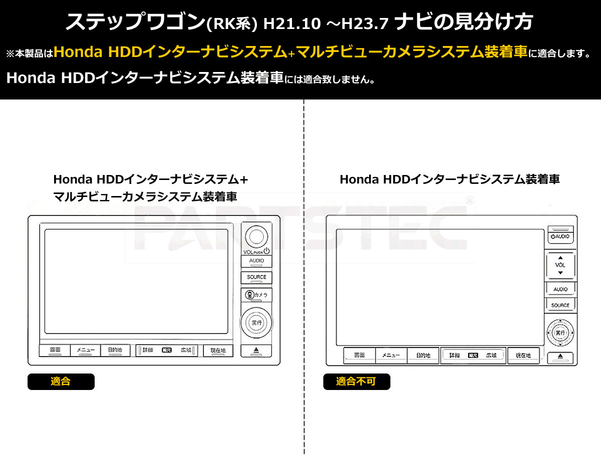 | 商品名 | HONDA メーカーオプション ナビ 対応 走行中 TV & DVD が見られるキット | 商品説明 | ●走行中に TV や DVD が見れるようになるコネクターになります。 ※DVDは再生機能付きナビに限ります。 ●フルオートタイプでスイッチ不要。 ●純正コネクター使用で取付は車体側とナビ側に入れるカプラーオンと、アース線をナビに取り付ける簡単取り付け。配線加工の必要なし。 ●取付後もナビ(GPS)/バックカメラ/ETC等は正常に機能します ※ご購入前に必ずカプラー形状のご確認をお願い致しますね! 適合車種 HONDA純正インターナビ/HDDインターナビ対応 ・ステップワゴン スパーダ/ Honda HDDインターナビシステム+マルチビューカメラ装着車 【RK5・6】 (H21.10~H23.7) ※【H21.10 ~H23.7】対象ナビは必ず適合ナビを画像でご確認ください。 ・ステップワゴン スパーダ/ Honda HDDインターナビシステム+マルチビューカメラ装着車 【RK5・6・7】 (H23.8~H24.3) ・ステップワゴン スパーダ/ ホンダインターナビ+リンクアップフリー+ETC車載器 【RK5・6】(H24.4~H27.4) ・ステップワゴン スパーダ/ Honda HDDインターナビシステム 【RK5・6】(H23.8~H24.3) ※39540-SZW-J01機種には適合致しません。 ※39540-SZW##系のメーカーオプション機種には適合致しません。 ※販売店・ディーラーオプションのナビには対応しておりませんのでご注意下さい。 ※走行中のナビ操作は行えませんのでご注意下さい。 ※適合はあくまで参考資料ですので、画像でよく確認しお間違いのないようにお願い致します。 |