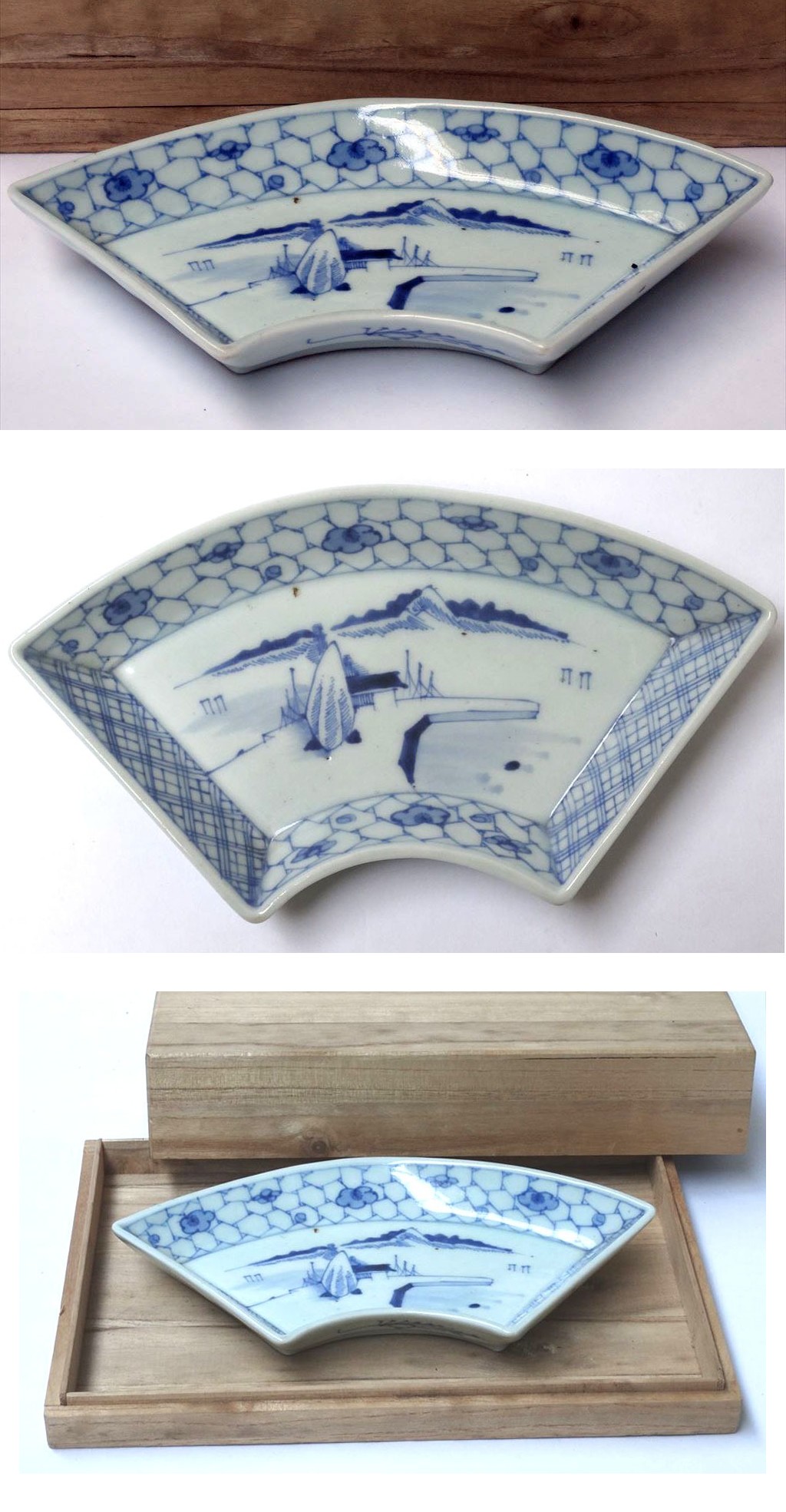 | 江戸時代 奥州・染付皿・仙台「切込焼」氷割文に梅花山磯部文「扇面皿」完品 桐箱付 | ||||
