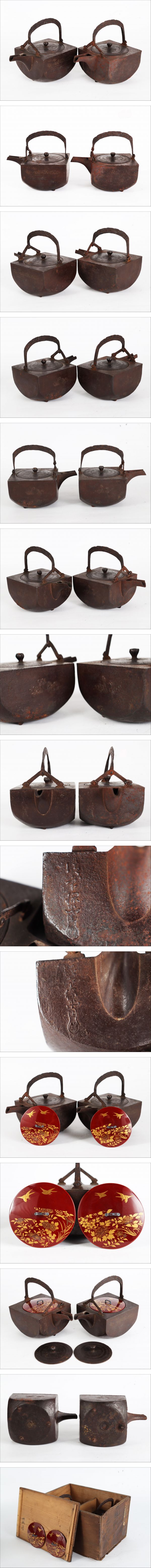 希少 釜師名人造 時代 狩野探幽法印守信 四方形銚子 一対 蒔絵替蓋(燗鍋酒器鉄瓶茶道煎茶) F7 收藏