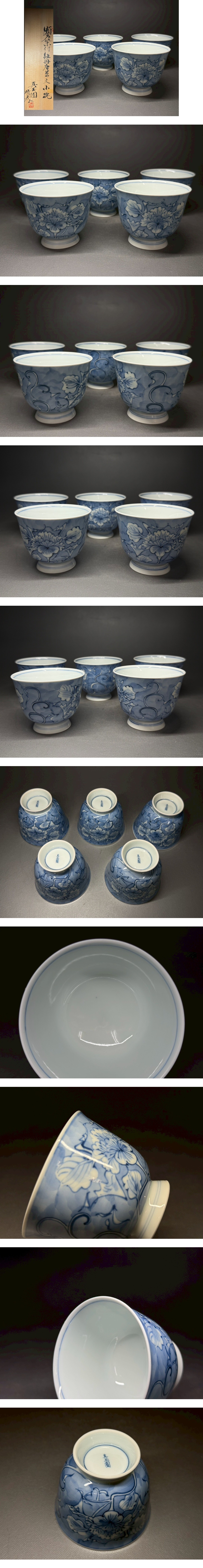 瀬戸染付 真玉園 加藤靖彦 牡丹唐菜文小碗 5客 骨董 置物 飾物 日本伝統工芸品 芸術 古美術 時代物 作家 在銘 落款 旧蔵出 初出18 收藏