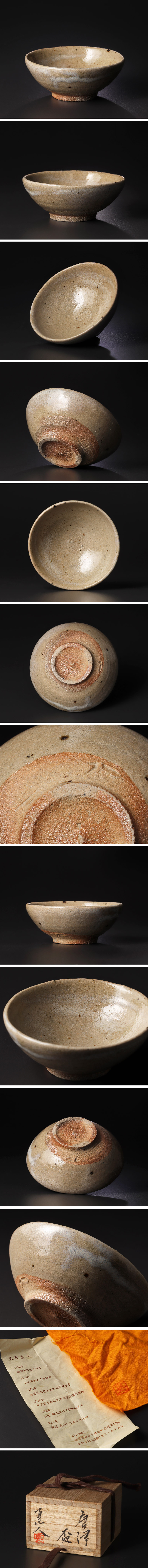 古唐津の源流を辿りながら、唐津の土や砂岩を自ら採取し、薪窯で焼き上げている作家の作品です。砂岩の産地ごとに異なる粒子や質を見極め、その特性を活かしながら黒唐津・朝鮮唐津・斑唐津・絵唐津など幅広く制作を続けています。素朴な土の温かみがしっとりと手に伝わり、静かな余韻を残す味わい深い盃です。 ★商品は矢野直人の作品である事を保証致します。 |
