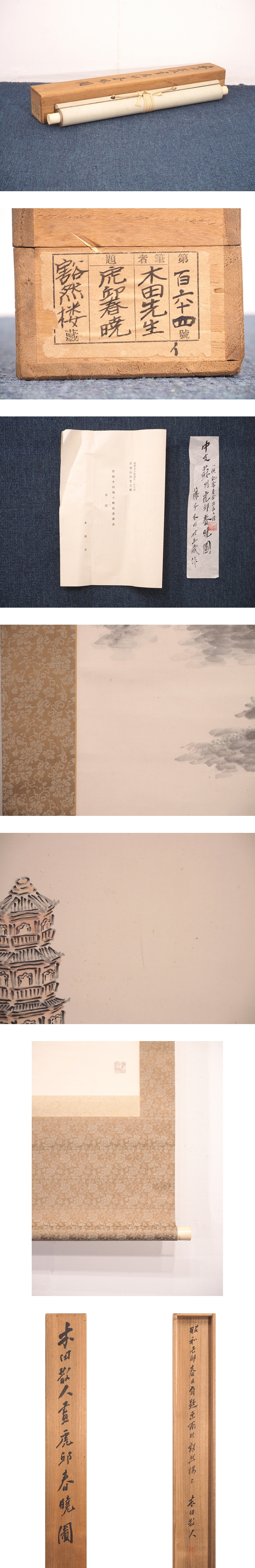 【真作】【渡鹿庵】[藤本木田] 21567 出展作 掛軸 日本画 「虎邱春暁図」 共箱 紙本 風景画 師田中柏陰 香川 在銘 收藏