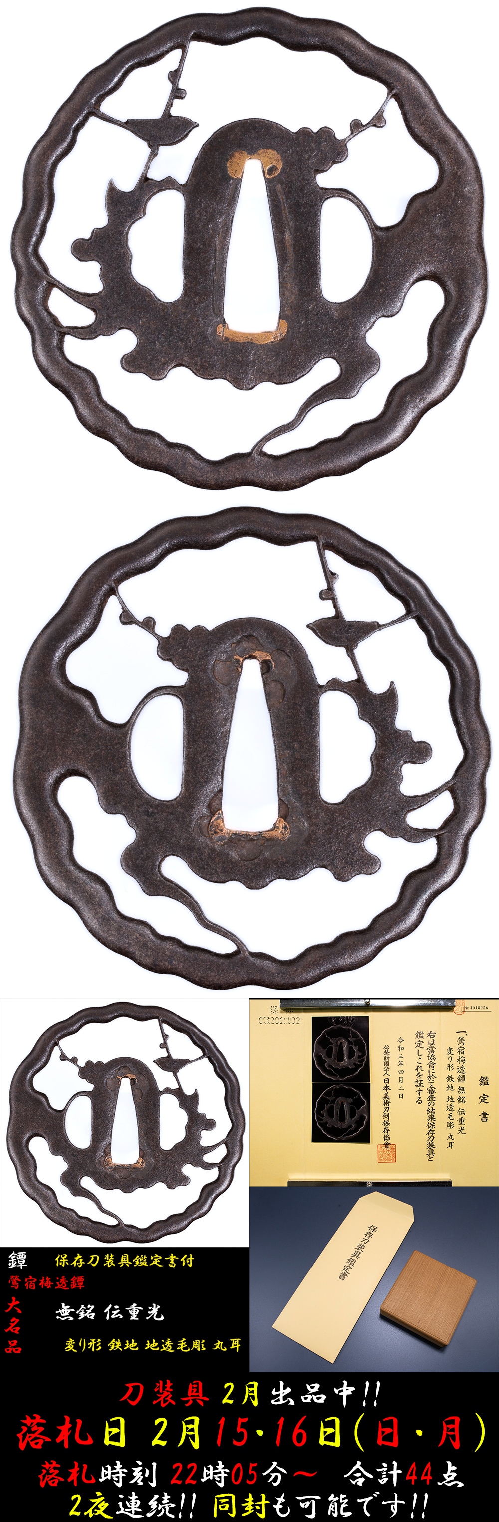 ★44■鐔■鶯宿梅透鐔★無銘 伝重光★変り形★鉄地★地透毛彫★丸耳★保存刀装具鑑定書付★大型鐔■鍔■ 收藏