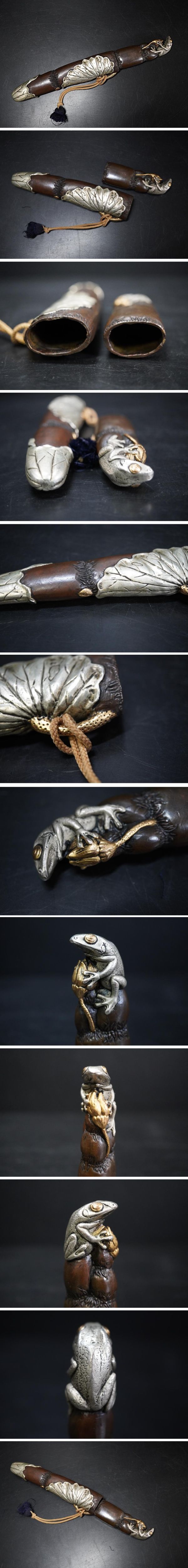 ご覧いただきありがとうございます。 時代金工 銅製 短刀拵え 蓮鞘に蛙柄 見立て茶室刀 茶道具 刀装具です。 擦れ疵、汚れ等ありますが、状態は良好です。(画像を確認の上、ご判断願います。)
