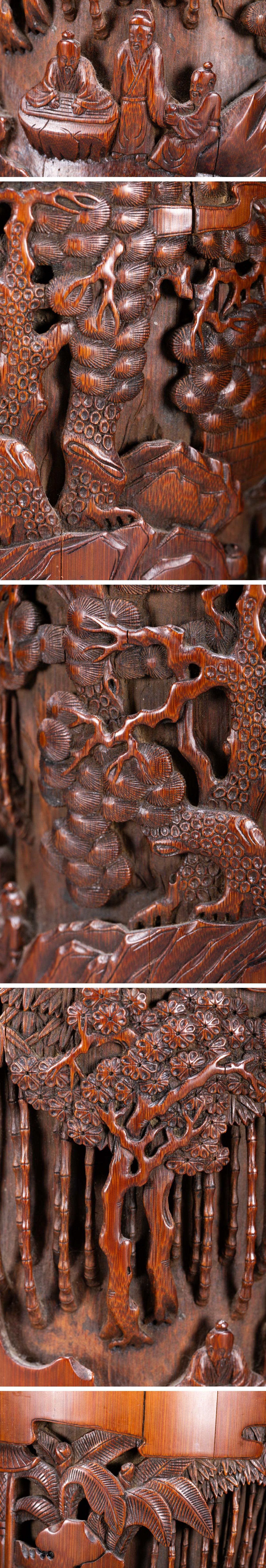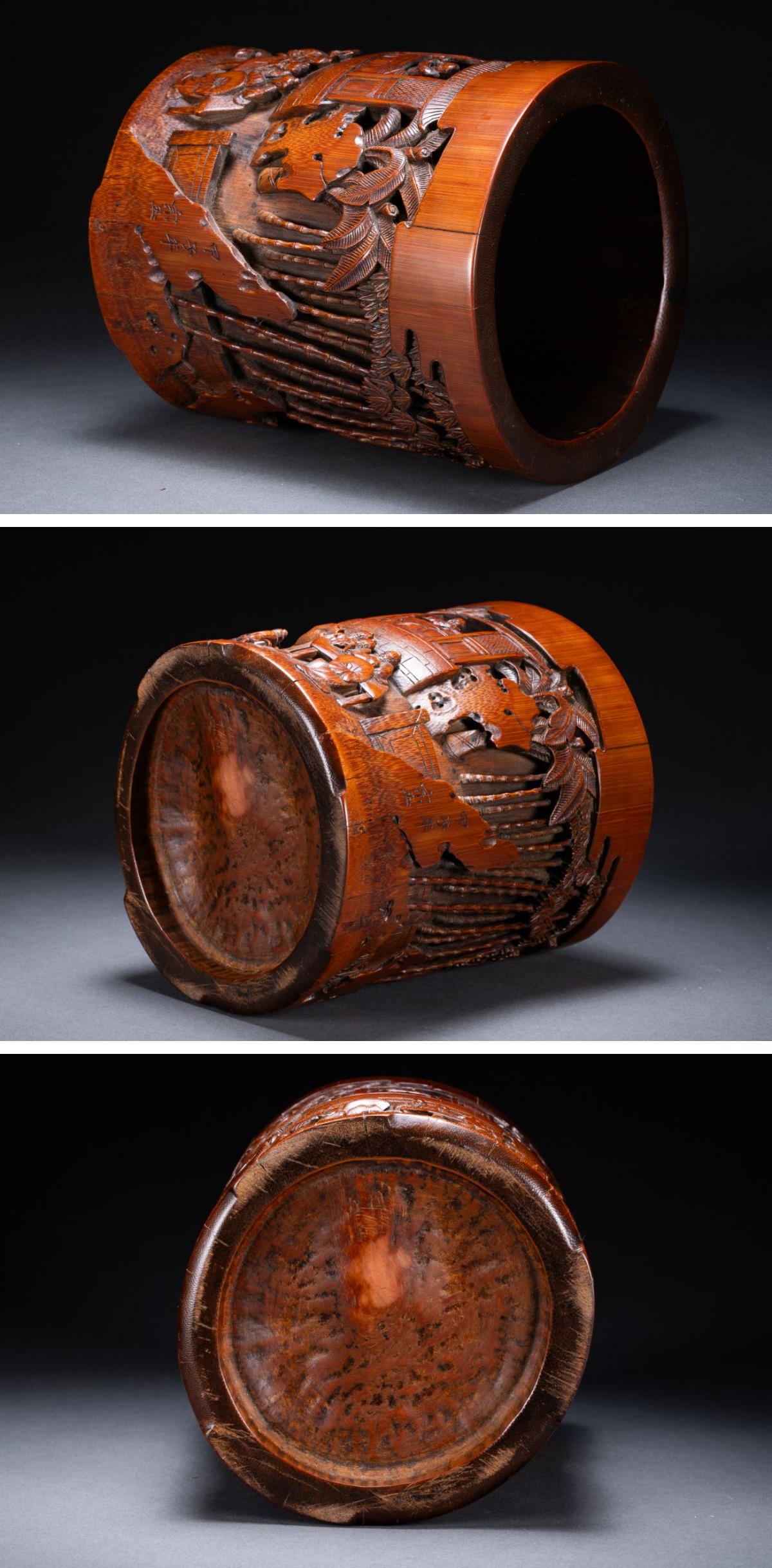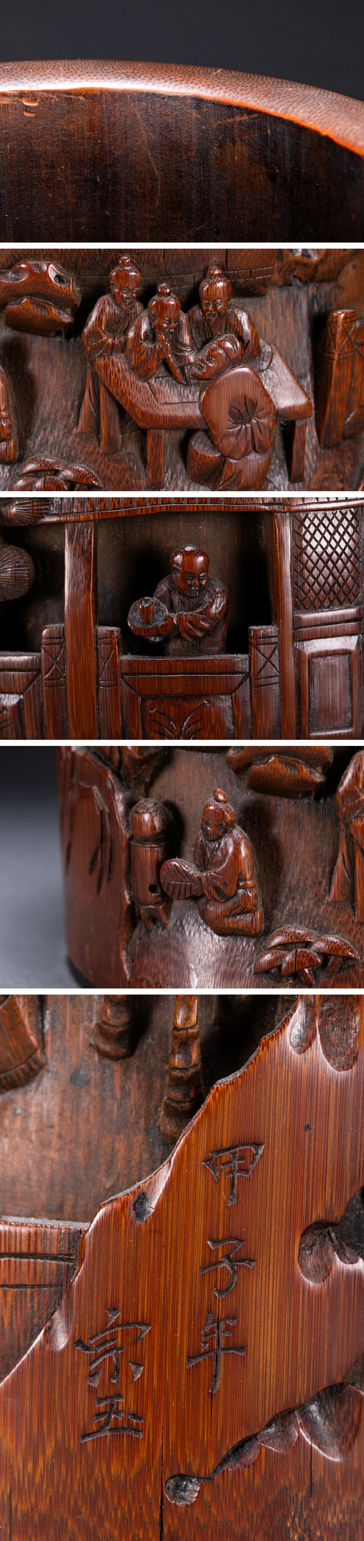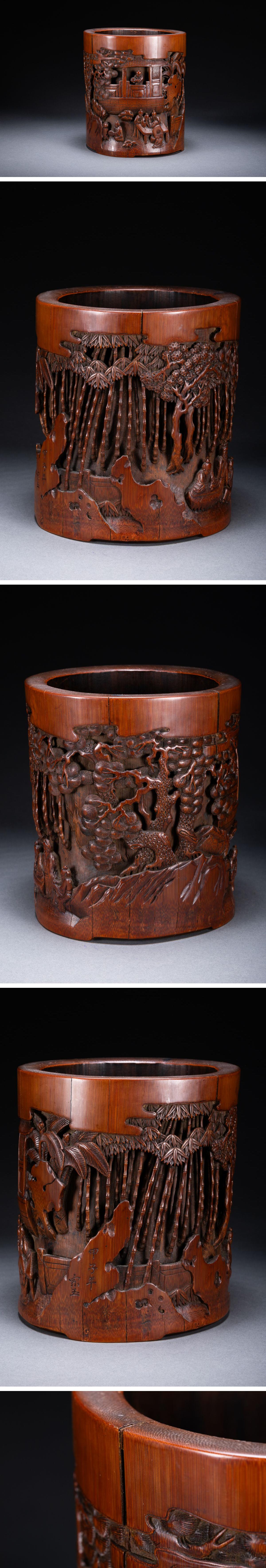 【雲錦】1円から 清時代 康煕期 古竹彫 人物紋筆筒 古書道具 時代物保証 古美術 骨董品WK9-40 收藏