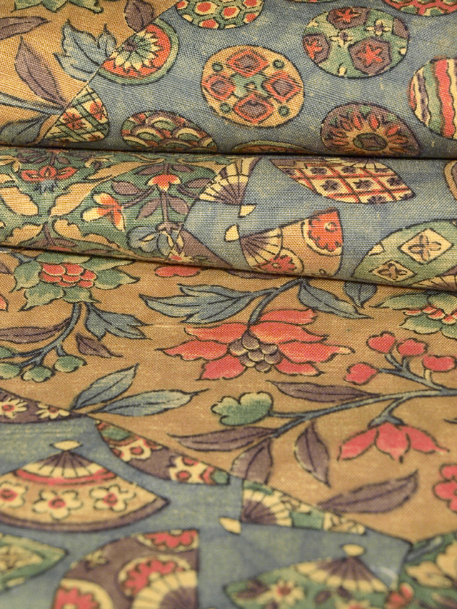 全体的な印象としては濃淡のある藍色、灰茶色、千歳緑色などの地に小紋の配された扇や丸、唐花草、唐花襷(からはなだすき)などの切りばめの文様が染められている紬のはぎれです。 更紗調であらわされた数々の文様が見た目に楽しげな雰囲気です。ややほっこり、ややさらりとした 手ざわりの紬らしい紬地です。 目につくしみやよごれ、褪色などのダメージは見あたらず、とてもきれいな状態です。風楽で洗い張り済みです。※風楽の出品内で同じ柄のものを複数出品している場合もあります。 |