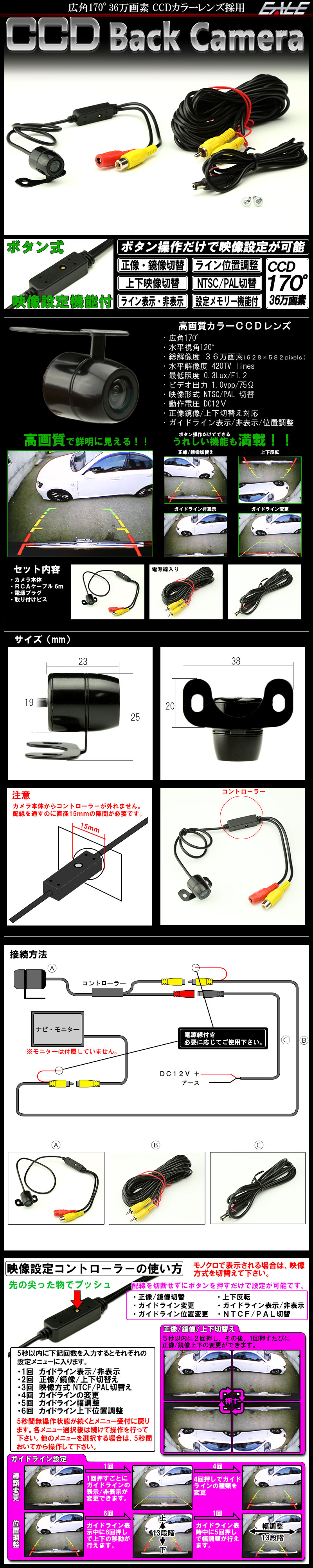 汎用 CCD バックカメラ 正像 鏡像 上下反転 スイッチ式 メニュー回数をプッシュするだけで正像、鏡像、上下反転、ガイドラインや位置調整に至るまで、さまざまな設定が可能です。 多機能を組み合わせる事でフロントカメラやサイドカメラとしてもご使用頂けます。 メモリー付きで電源を切っても設定した内容で再起動します。 他のカメラは⇒こちら モニターは⇒こちら |