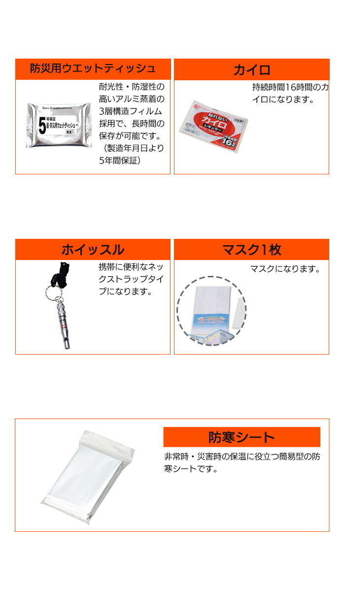 | 商品説明 | 「くまモン」の非常持ち出しポーチセット。 災害時はもちろんのこと、普段の持ち運ぶポーチとしても使えます。 ポーチには防災カードが付いており、「住所・氏名・性別・血液型・連絡先・購入日・非常時避難場所」が記入できます。 くまモンのプチライトは便利なカラビナタイプでLEDを使用しています。 【仕様】 ▼ 重量 約(箱入)0.44kg ▼ 材料 [ポーチ]ポリエステル ▼ 内容 ◇くまモンのポーチ(約235×290×35mm)(防災カード付き) ◇くまモンのプチライト(ボタン電池CR1220×1個) ◇防寒シート ◇マスク1枚 ◇カイロ ◇ホイッスル ◇防災用ウエットティッシュ ▼ 備考 許諾番号?2010 熊本県 くまモン K13723<JAN>4997747214059 ▼ キーワード くまもん ポーチ 肩掛け かばん くま クマ かわいい カバン バッグ ライト LED 防災 非常持出し袋 災害 防災グッズ 子供用 こども キッズ 【同シリーズ】 ※【同シリーズ】のリンクは当店の店のページへ進みます。 ●くまモンの非常持出しリュック(ライト付) ●くまモンの非常持出しリュックセット ●くまモンの非常持出しリュックセット ●くまモンの非常持出しポーチセット(A) ●くまモンの非常持出しポーチセット(B) ●くまモンの非常持出しポーチ&リュックセット ※このページは「くまモンの非常持出しポーチセット(B)」を販売しております。 |
