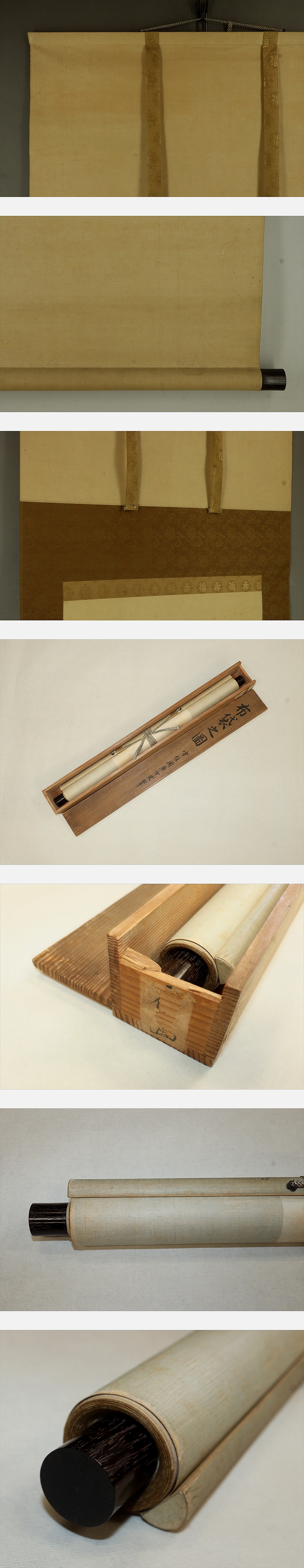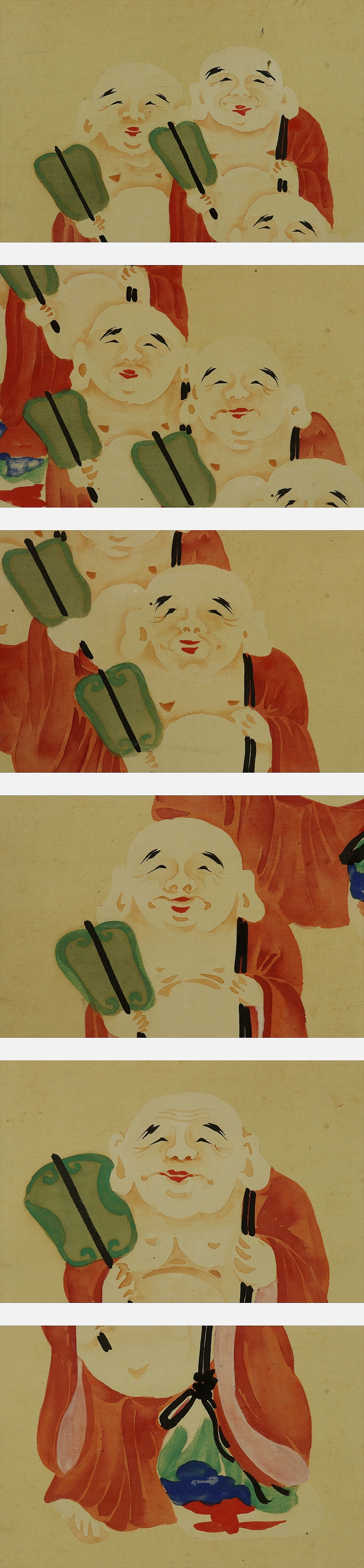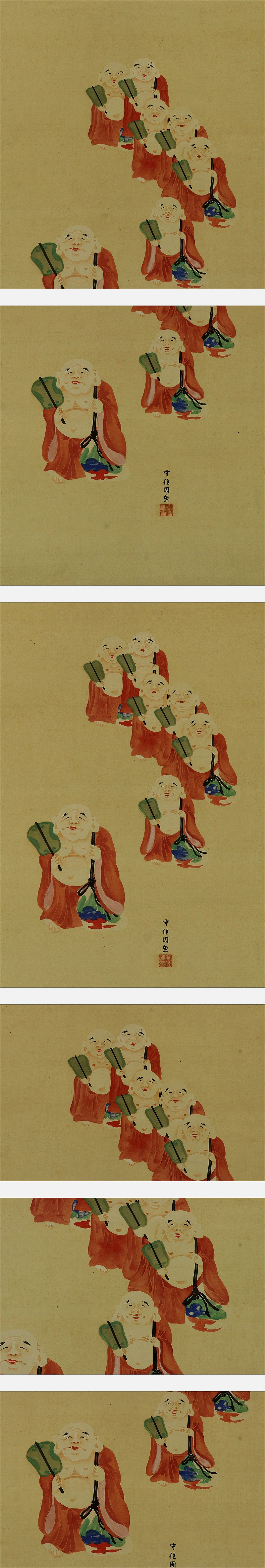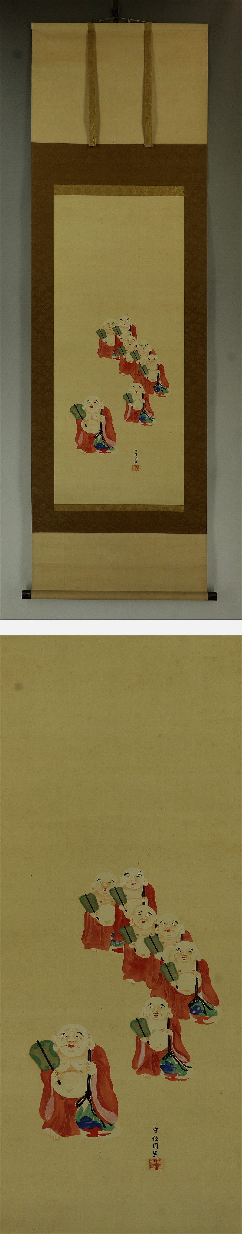 №2502026 珍品【模写】守住周魚【七布袋図】◆絹本◆合箱◆掛軸 | |
