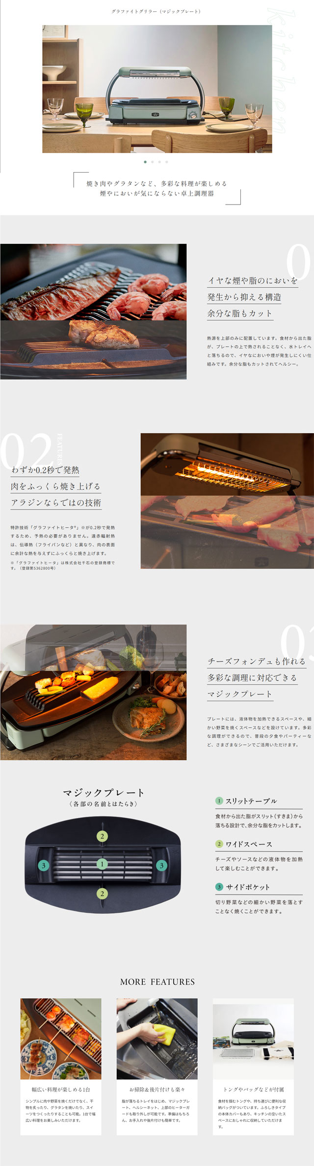 アラジン グラファイトグリラー(マジックプレート) CAG-G13B(G) を出品いたします。 ■特徴■ 焼き肉やグラタンなど、 多彩な料理が楽しめる 煙やにおいが気にならない 卓上調理器 イヤな煙や脂のにおいを 発生から抑える構造 余分な脂もカット 熱源を上部のみに配置しています。 食材から出た脂が、 プレートの上で熱されることなく、 水トレイへと落ちるので、 イヤなにおいや煙が発生しにくい仕組みです。 余分な脂もカットされてヘルシー。 わずか0.2秒で発熱 肉をふっくら焼き上げる アラジンならではの技術 特許技術「グラファイトヒータ」※が 0.2秒で発熱するため、 予熱の必要がありません。 遠赤輻射熱は、伝導熱(フライパンなど)と異なり、 肉の表面に余計な熱を与えずに ふっくらと焼き上げます。 ※「グラファイトヒータ」は株式会社千石の登録商標です。(登録第5362800号) チーズフォンデュも作れる 多彩な調理に対応できる マジックプレート プレートには、液体物を加熱できるスペースや、 細かい野菜を焼くスペースなどを設けています。 多彩な調理ができるので、 普段の夕食やパーティーなど、 さまざまなシーンでご活用いただけます。 ■仕様■